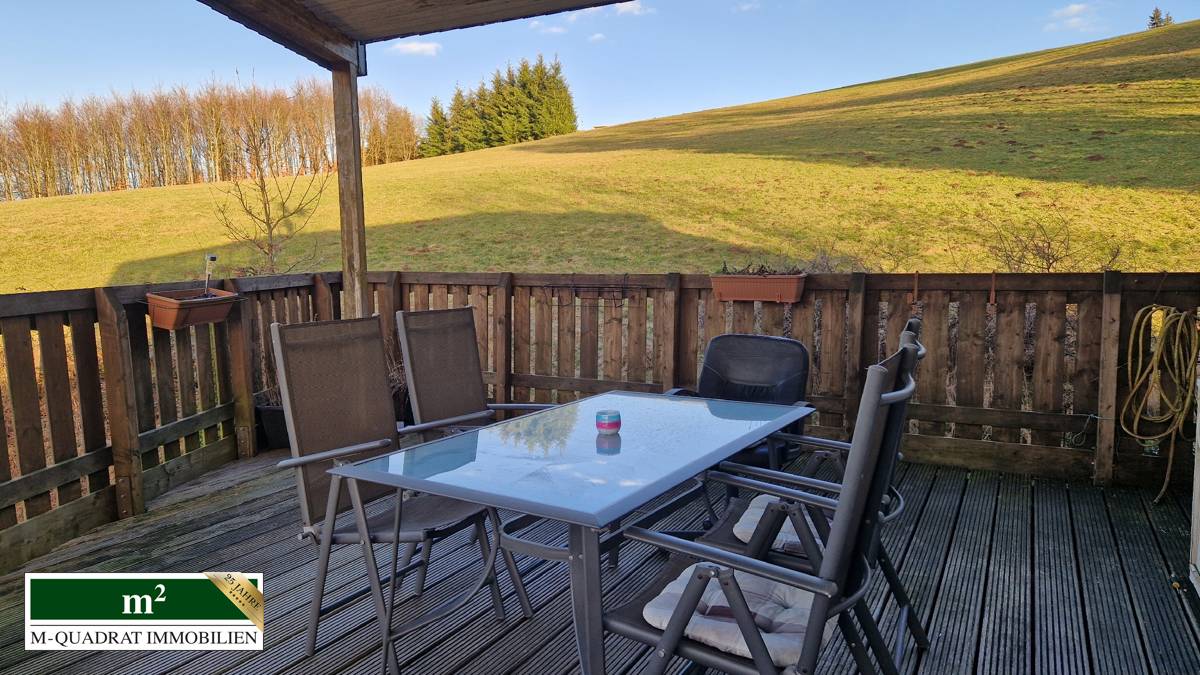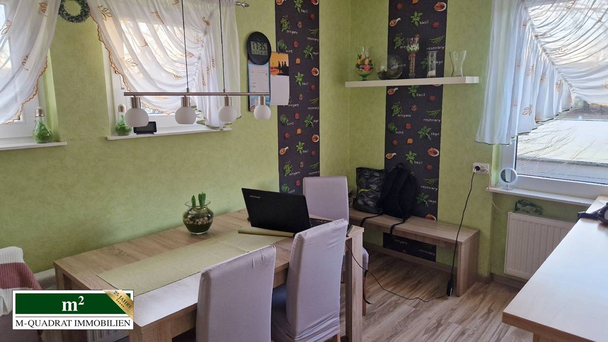 Die Wohnung im Obergeschoss mit einer Wohnfläche von 80 m² teilt sich wie folgt auf: Zwei Schlafräume, Flur, Küche, Bad mit Wanne, Wohnzimmer, Kellerraum und einer großen Terrasse mit ca. 60m².