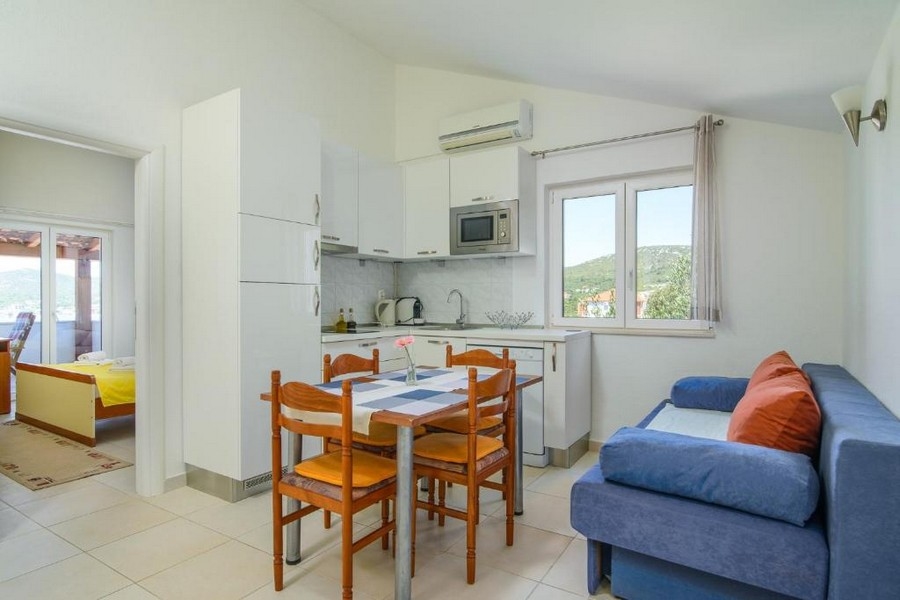 Die Immobilie besteht aus zwei Wohnungen auf der ersten und zweiten Etage, die insgesamt Platz für bis zu zehn Personen bieten. Jede der beiden Wohnungen verfügt über ein Wohn-/Esszimmer mit einer Küche, zwei Schlafzimmern, ein Badezimmer mit WC und eine großzügige Terrasse.