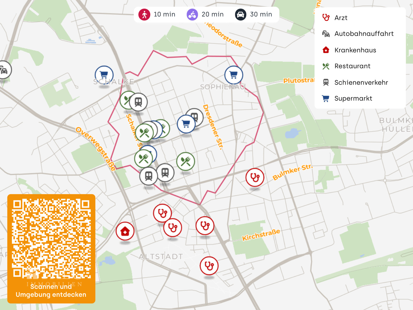 Schalke profitiert von einer sehr guten Verkehrsanbindung. Die Gelsenkirchener Innenstadt sowie der Hauptbahnhof sind in wenigen Fahrminuten erreichbar und gewährleisten eine schnelle Anbindung an das regionale und überregionale Verkehrsnetz des Ruhrgebiets. Haltestellen des öffentlichen Nahverkehrs befinden sich in unmittelbarer Nähe zum Objekt und sichern eine komfortable Erreichbarkeit auch ohne PKW.