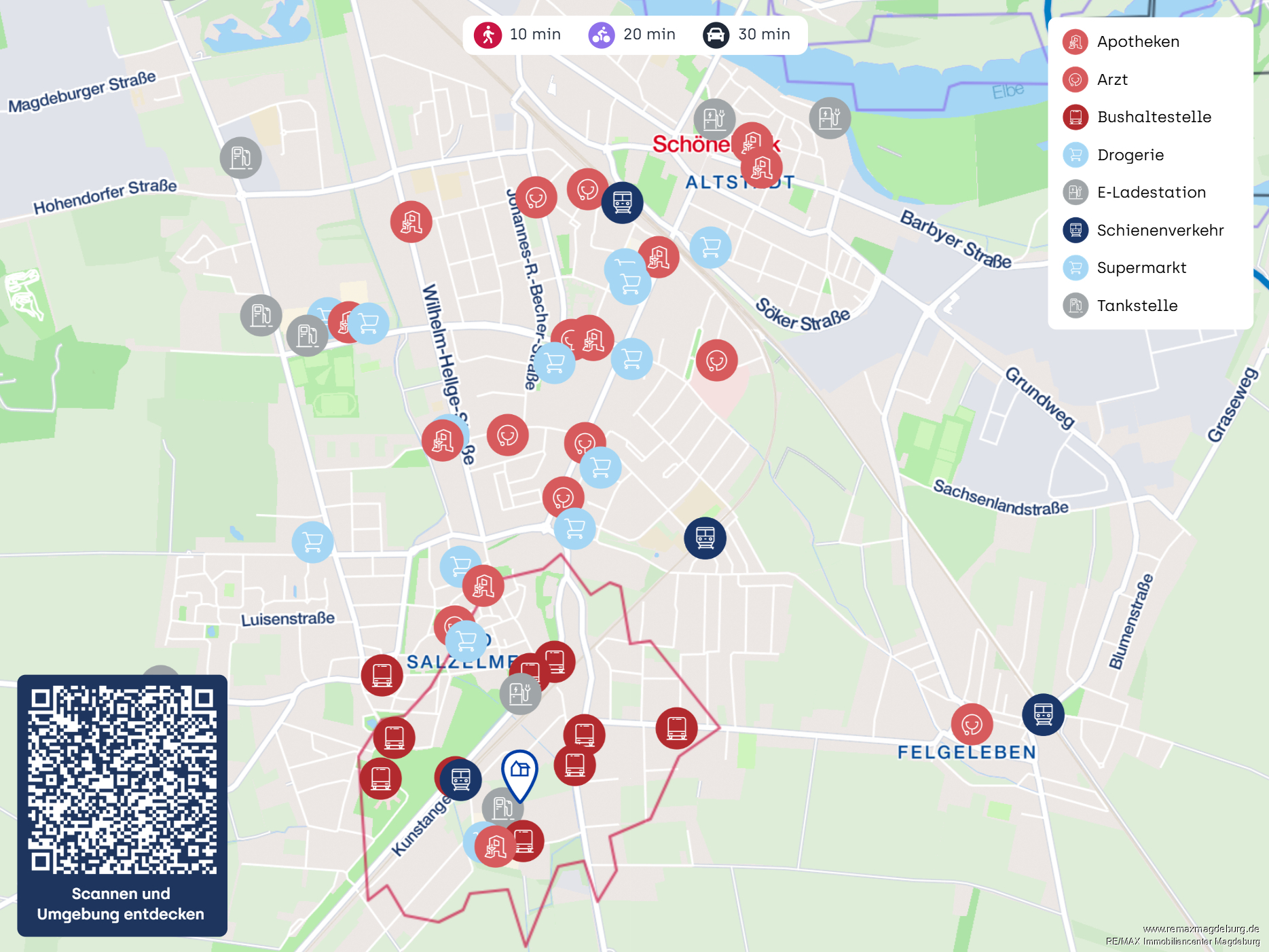Die Umgebung zeichnet sich durch eine angenehme Mischung aus Wohnbebauung und kleineren Dienstleistungs- und Gewerbebetrieben aus. Der nahegelegene Kurpark Bad Salzelmen, das älteste Soleheilbad Deutschlands, sowie die Elbauen bieten zudem vielfältige Möglichkeiten zur Erholung und Freizeitgestaltung im Grünen.