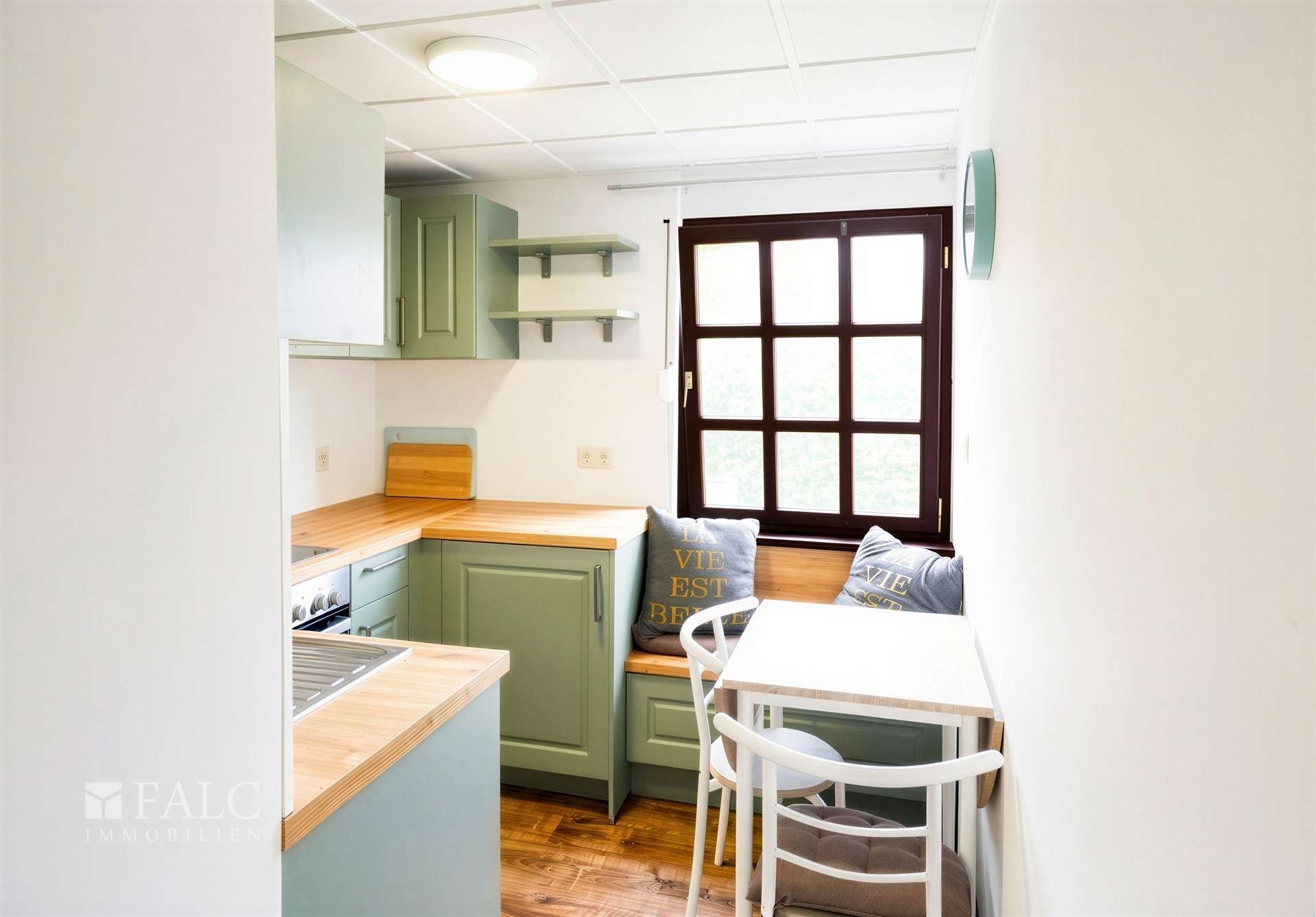 Direkt gegenüber liegt die Küche, die Arbeitsfläche schafft gute Ablagemöglichkeiten und die Schränke bieten Stauraum für alles, was man benötigt. Besonders schön ist die integrierte Sitzecke am Fenster, ein Platz für den ersten Kaffee am Morgen oder das Abendessen in vertrauter Atmosphäre.