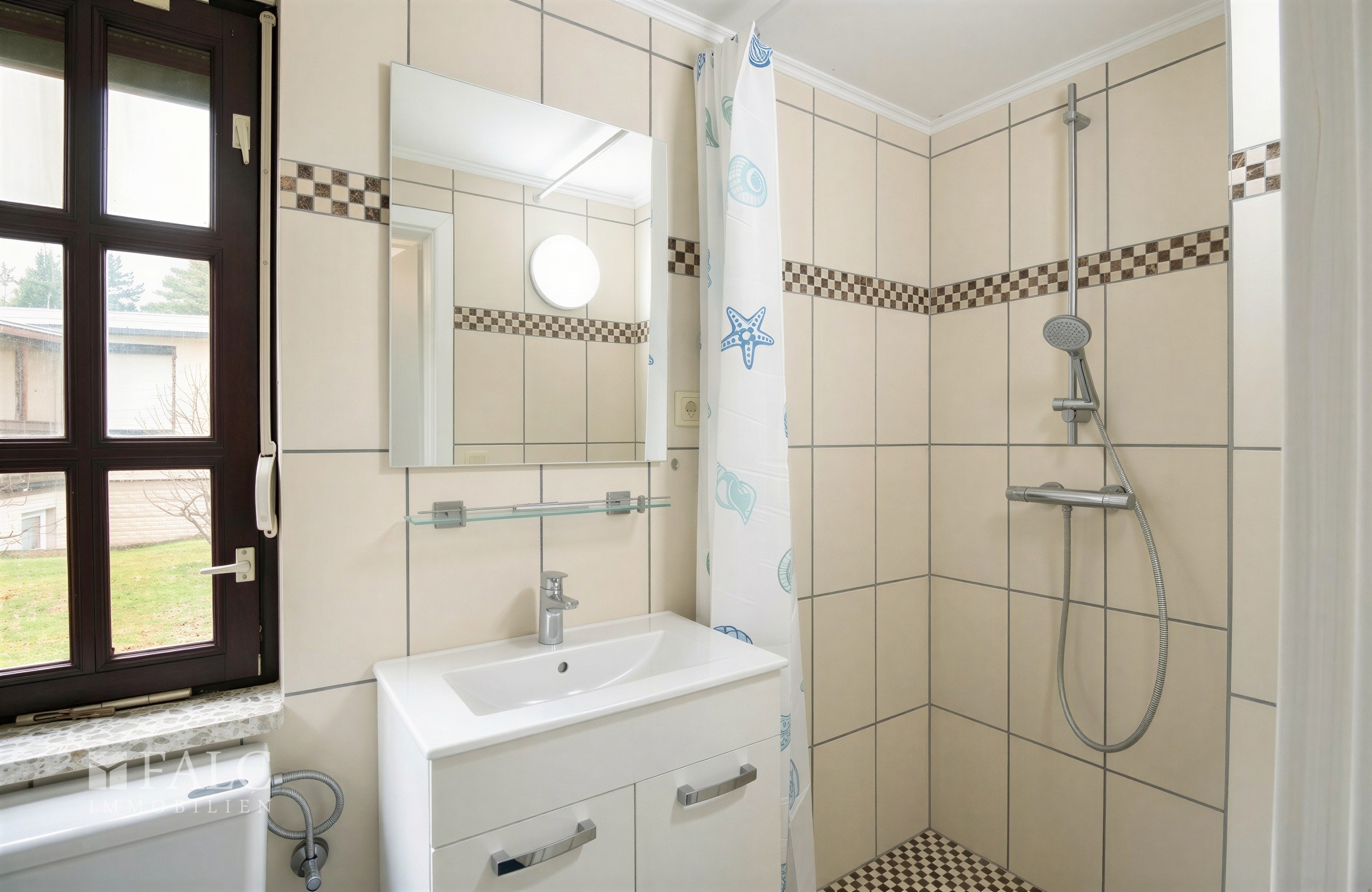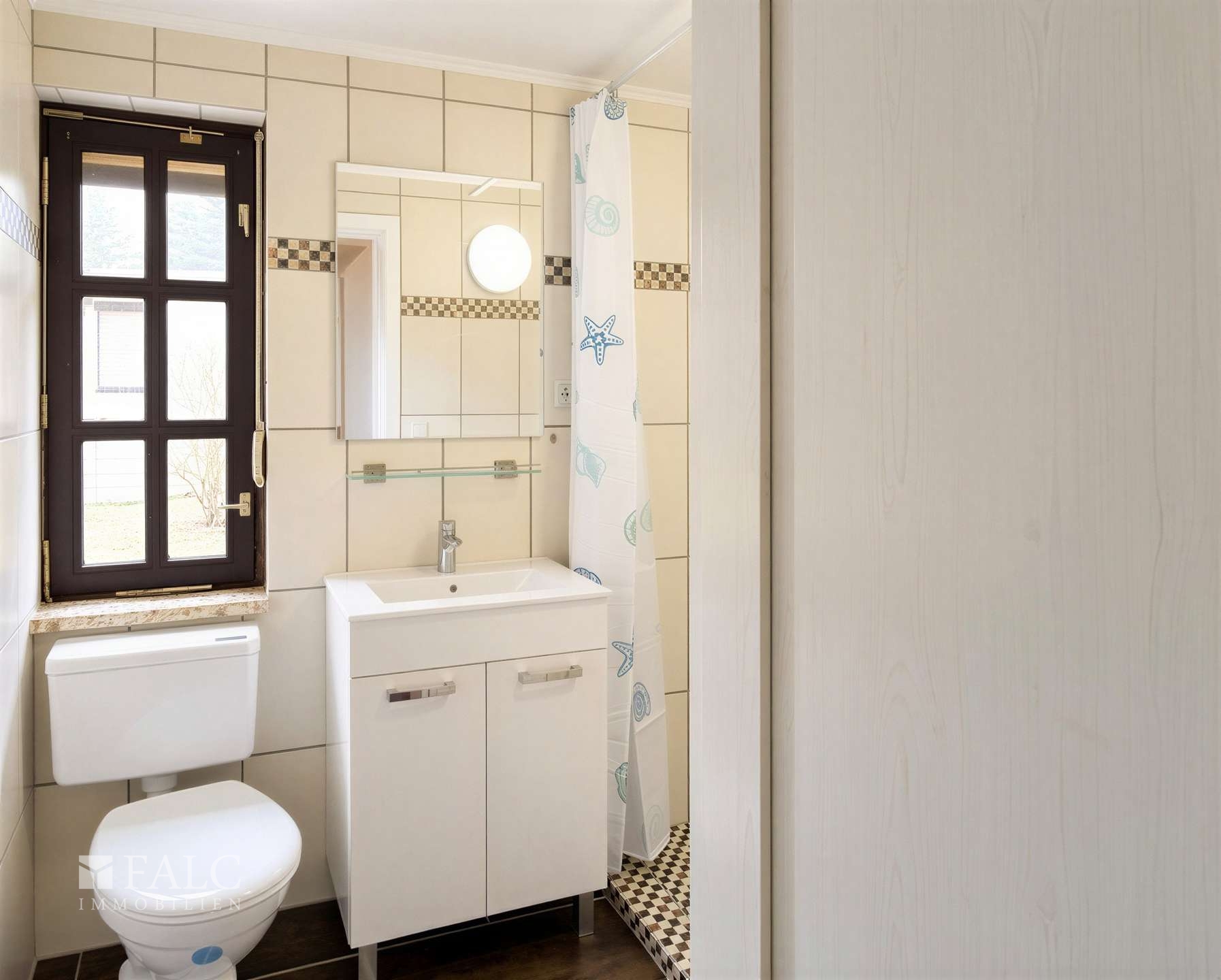 Das Badezimmer ist hell gefliest und mit einer Dusche, Waschbecken und WC ausgestattet. Die klare Gestaltung wirkt ordentlich und zeitlos, ideal für einen unkomplizierten Start in den Tag.