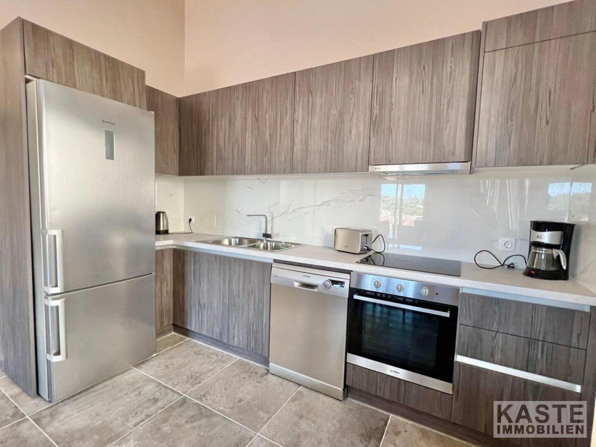 Auf der unteren Ebene befinden sich eine voll ausgestattete Designerküche, ein geräumiges Ess-/Wohnzimmer, ein Badezimmer mit Dusche und ein Schlafzimmer mit Doppelbett und Zugang zur vorderen Terrasse mit Meerblick.