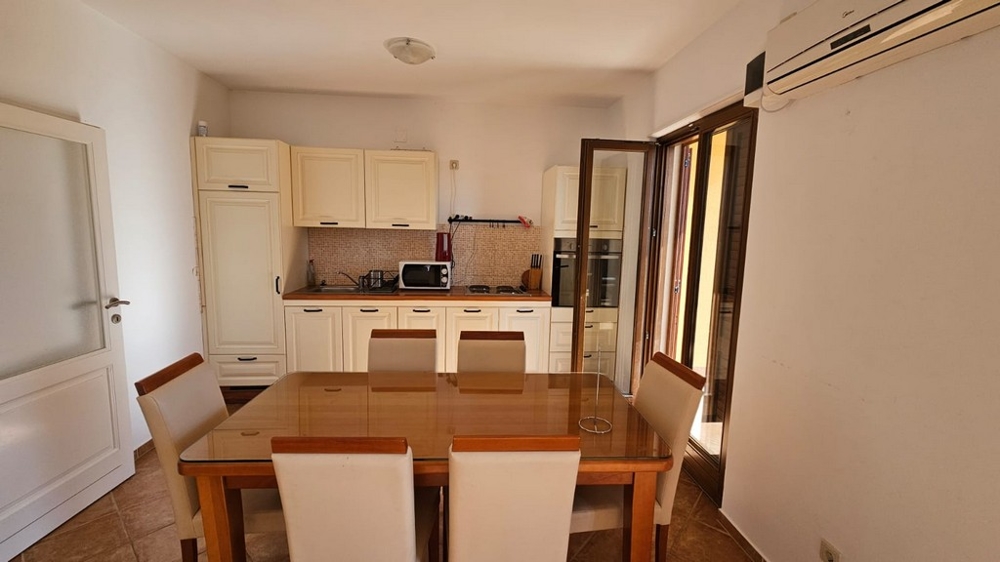 Zur Wohnung gehört eine etwa 23 m² große, teils überdachte Terrasse mit Ausblick auf das Meer. Die Immobilie ist vollständig eingerichtet, mit Klimaanlage ausgestattet und bietet einen zugewiesenen Außenstellplatz.