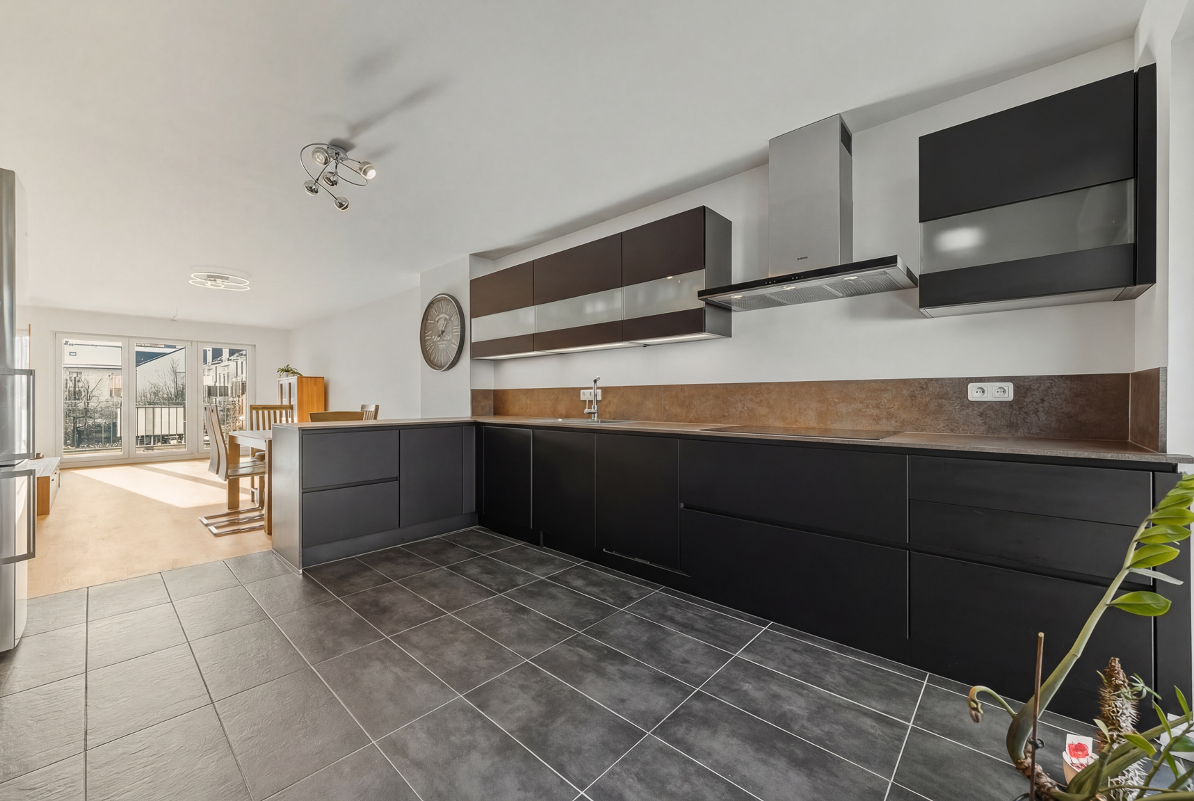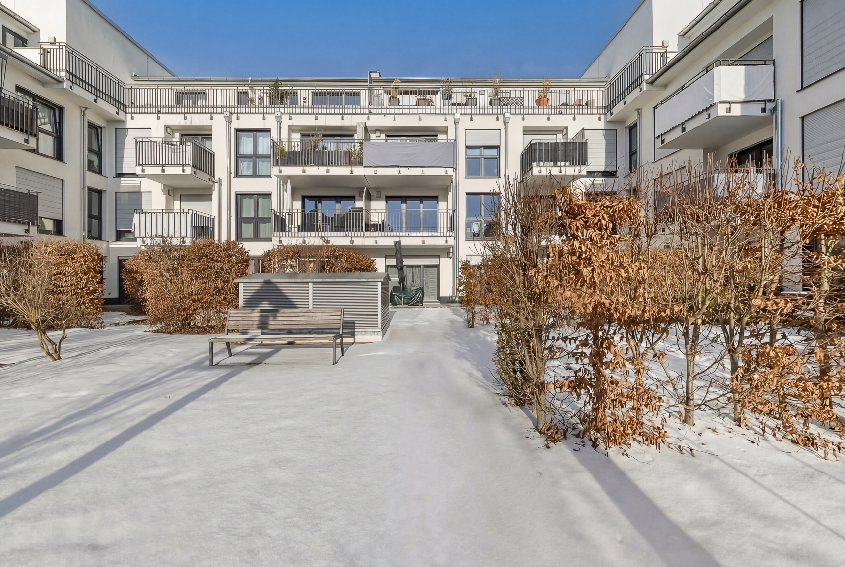 Herzstück der Wohnung ist der großzügige Wohn- und Essbereich mit offener Küche. Die exklusive Einbauküche ist mit Marken-Elektrogeräten ausgestattet und fügt sich harmonisch in den Raum ein. Von hier aus betreten Sie den nach Südwest ausgerichteten Balkon mit Blick in den ruhigen, grünen Innenhof. Ob Frühstück im Sonnenschein oder entspannte Abende mit Freunden – hier genießen Sie fast ganztägig die Sonne und echte Erholung.