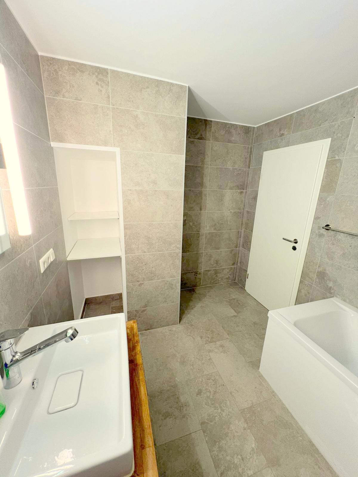 Das Badezimmer wurde ebenfalls aufwendig saniert und überzeugt mit moderner Ausstattung, darunter eine Badewanne sowie ein Handtuchheizkörper, der zusätzlichen Komfort bietet.
