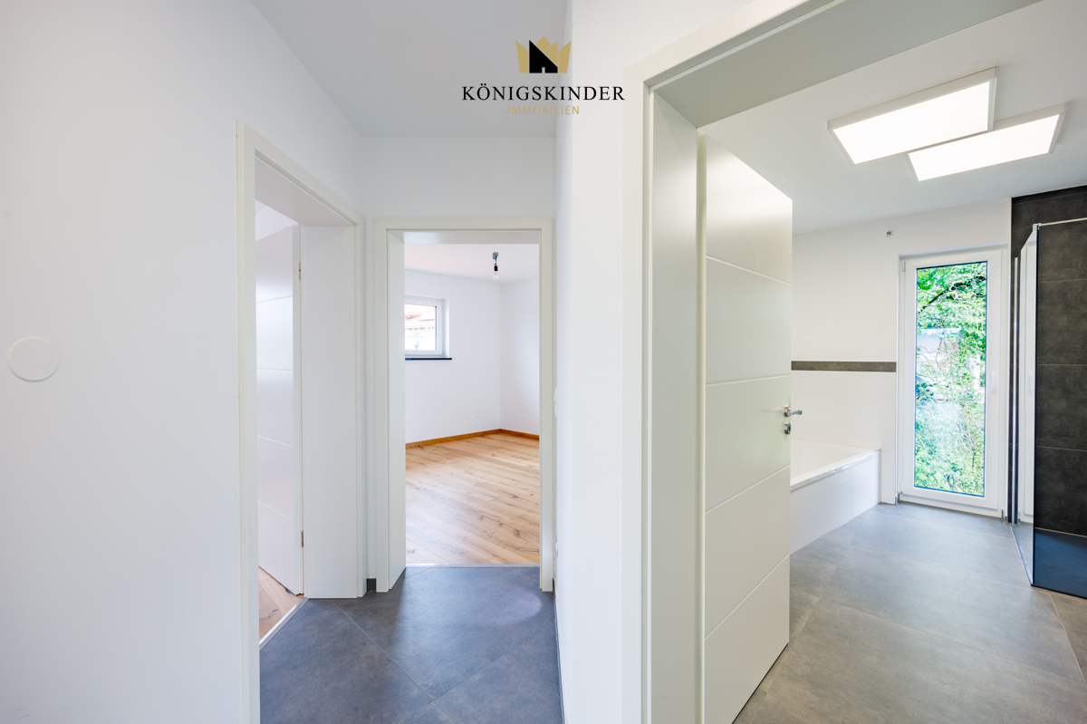 Über eine großzügige Treppe kommen Sie ins Obergeschoß (Erstbezug) zum Eingangsbereich, der führt Sie direkt in alle Räume der Wohnung und bietet genügend Platz. Die beiden Badezimmer verfügen über Bodenebene Duschen mit Tageslicht und ein Bad davon, zusätzlich eine Badewanne. An ein Badezimmer grenzt das Schlafzimmer, gefolgt vom Kinderzimmern oder Büros, passend nach Ihren Wünsche. Alle Räume sind hell, hoch und geräumig. Die Küche ist offen zum Wohn- und Essbereich und da es sich um ein Erstbezug handelt, können Sie sich frei nach Ihrem Wunsch einrichten, bezüglich der Geräte und Optik. Der große Wohn- und Essbereich ist das Herzstück der Wohnung und lädt zu geselligen Abenden ein.