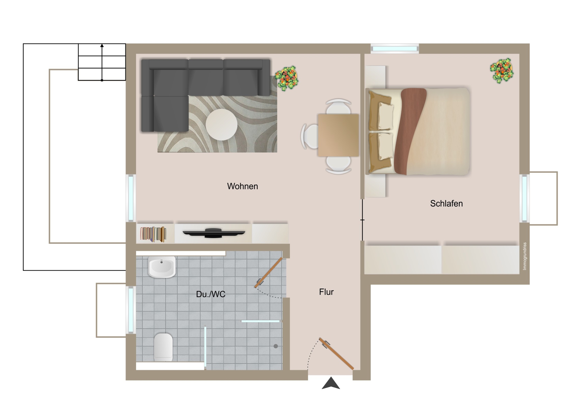 Von hier aus gelangen Sie direkt auf die kleine Terrasse, die zusätzlichen Freiraum im Alltag bietet und zu entspannten Momenten im Freien einlädt.