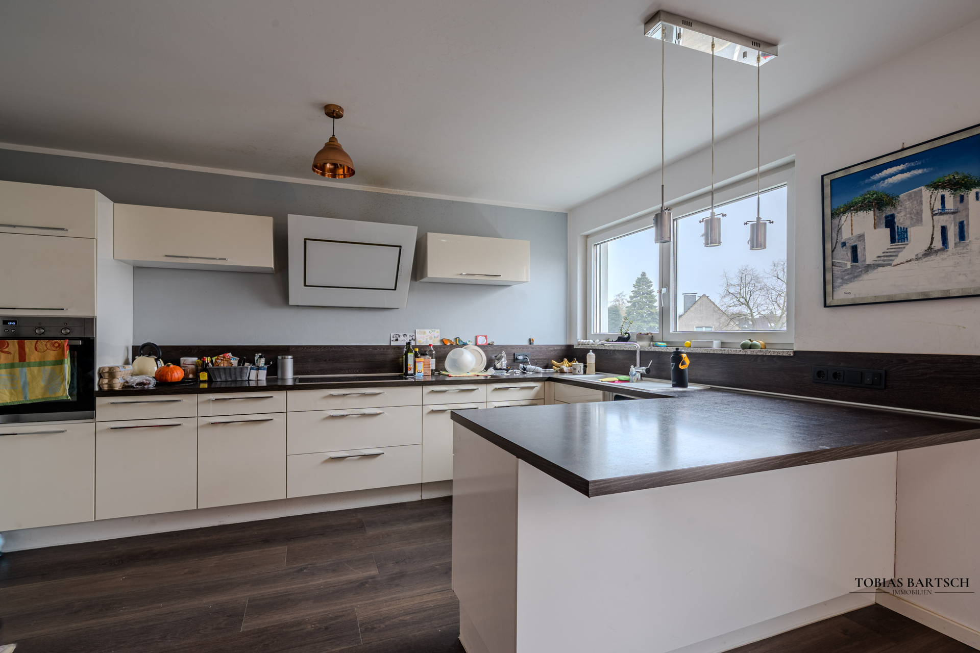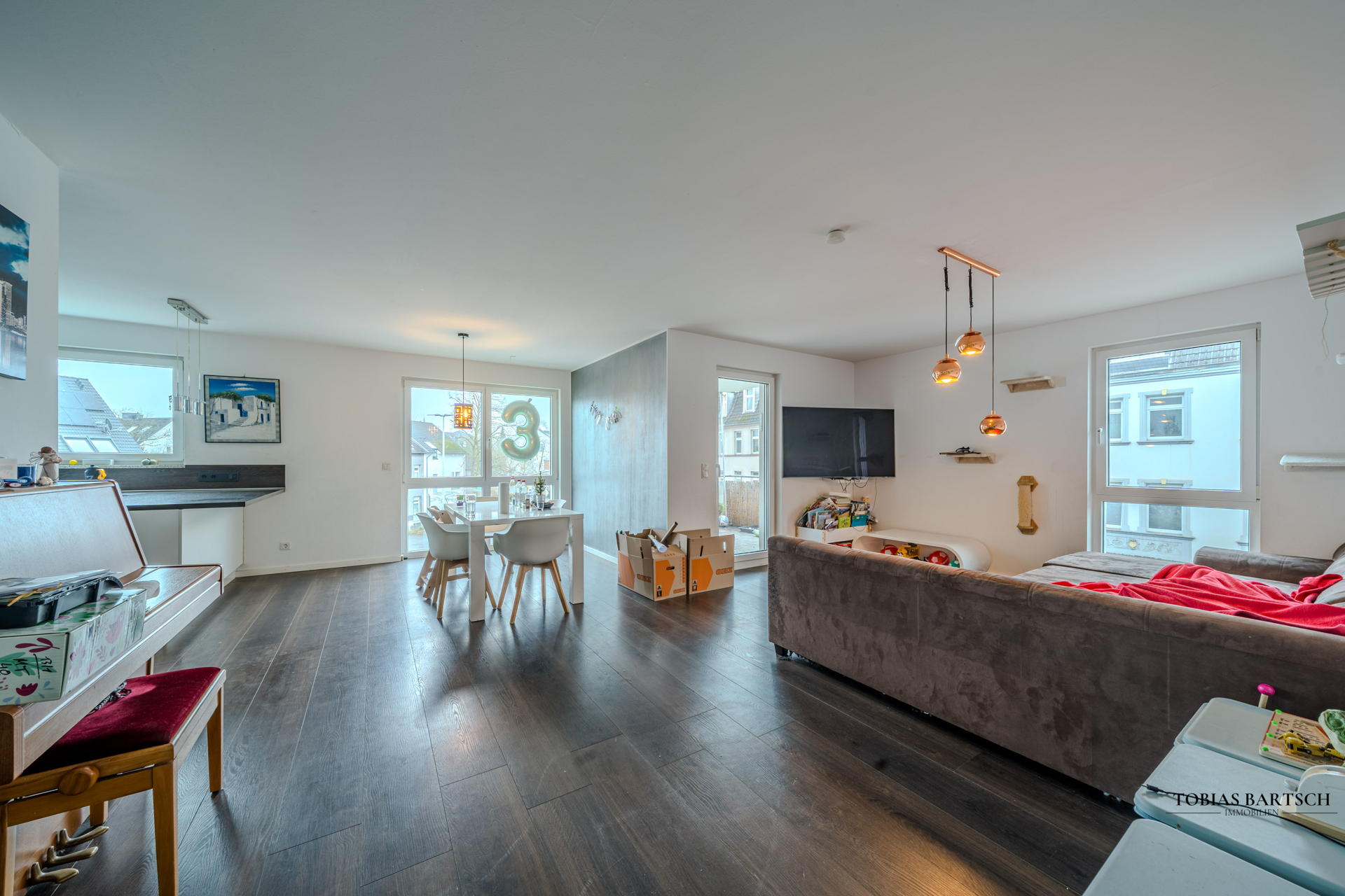 Herzstück der Wohnung ist der beeindruckende Wohn- und Essbereich mit ca. 34 m², der durch zahlreiche großflächige Fenster mit Tageslicht durchflutet wird und eine angenehme Wohnatmosphäre schafft. Die offen gestaltete Einbauküche fügt sich harmonisch in den Wohnbereich ein und unterstreicht den modernen Charakter der Immobilie. Von hier aus gelangen Sie auf den ca. 7,4 m² großen Balkon, der zusätzlichen Freiraum im Alltag bietet.