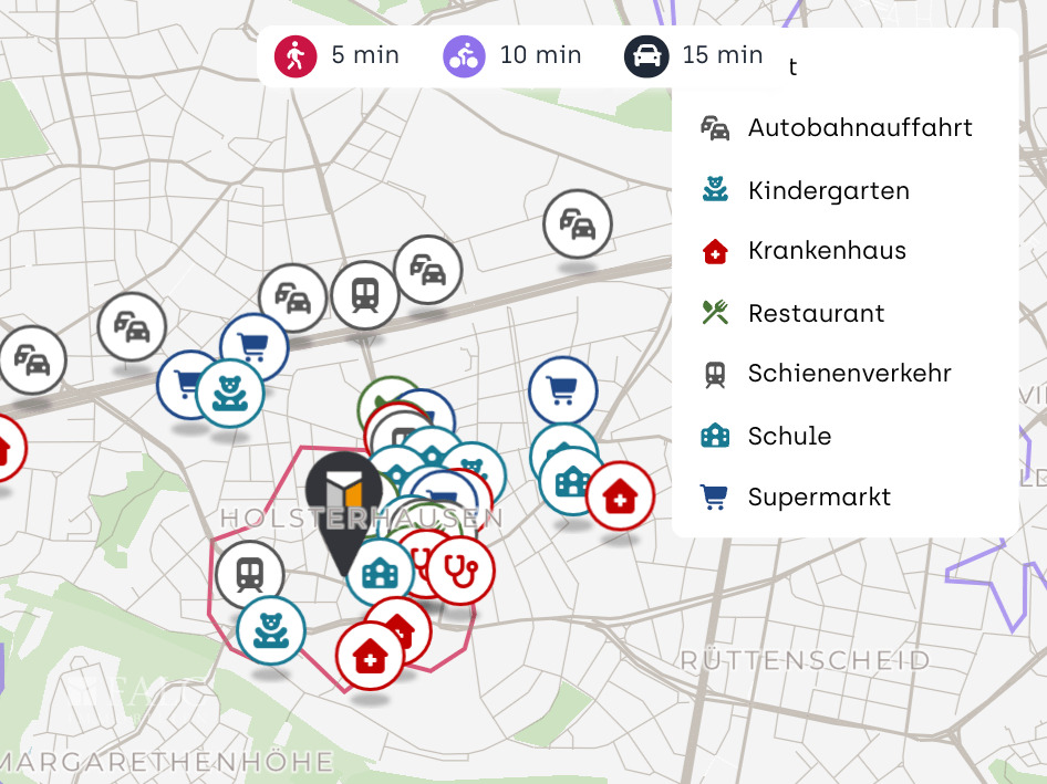 Freizeit und Ausgehen Für Erholung im Grünen bieten sich ein Park in ca. 300 m sowie der Bonsaigarten in ca. 700 m an. Sportlich Aktive finden Angebote wie Tvg Holsterhausen in ca. 700 m. Kulinarisch ist die Umgebung ebenfalls angenehm: Das Restaurant Finster liegt in ca. 100 m, weitere Restaurants wie Manolya und Asia Sushi Bar sind in wenigen Gehminuten erreichbar. Wer den Abend gern außer Haus ausklingen lässt, findet mit der Menehune Cocktailbar oder Zizou Bar und Brasserie Optionen in der näheren Umgebung.