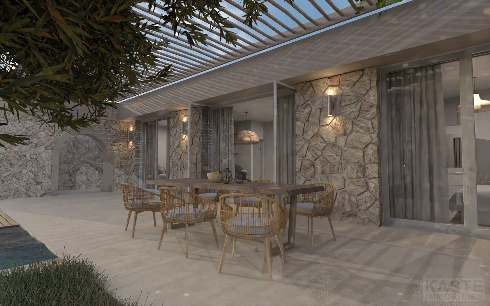 Terrasse und BBQ-Bereich: Die nach Süden ausgerichtete Terrasse mit Pergola bietet den idealen Ort für einen Grillabend unter griechischem Sternenhimmel. Genießen Sie regionale Spezialitäten und einen griechischen Wein in entspannter Atmosphäre, um einen perfekten Strandtag abzurunden.