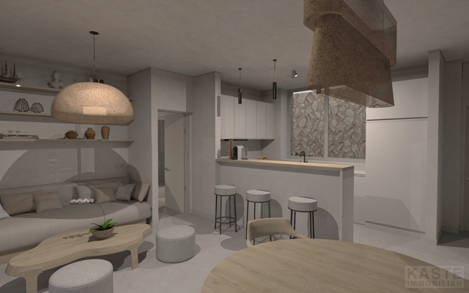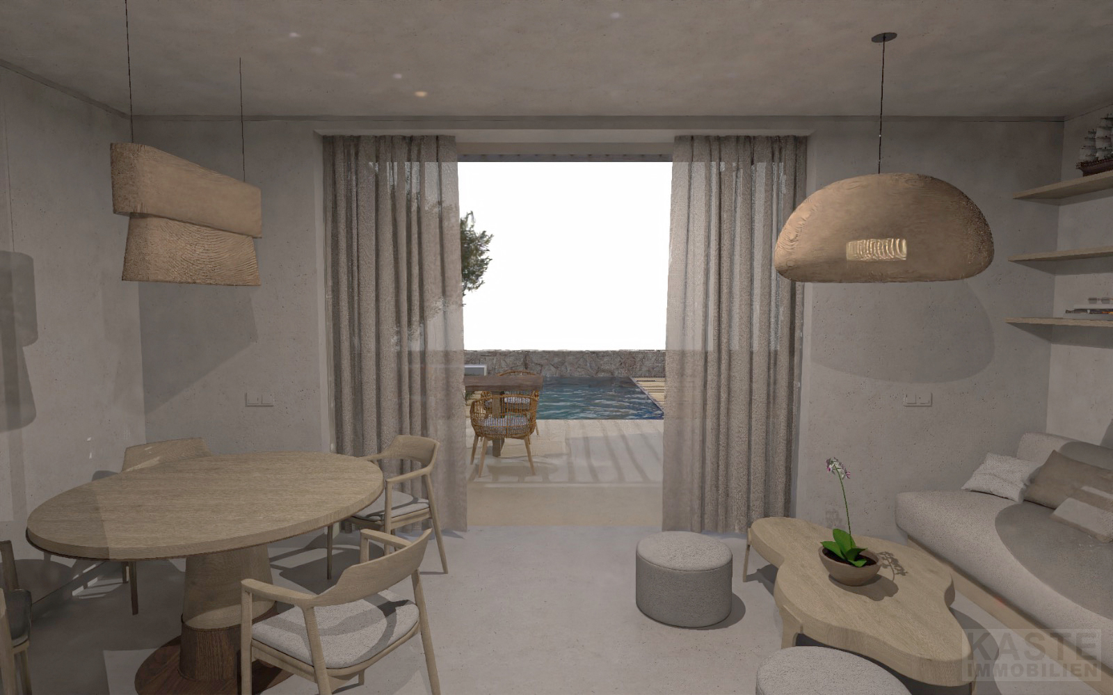 Wohnbereich und Küche: Das Innere der Villa ist geprägt von Funktionalität und Helligkeit. Der offene Wohnbereich fließt nahtlos in eine voll ausgestattete Küche über und schafft so eine luftige Atmosphäre. Die moderne Architektur und Technik sorgen für ein perfektes Wohngefühl und eine Vielzahl praktischer Eigenschaften. Die perfekte Kulisse, um beim Kochen mit Ihren Gästen zu plaudern.