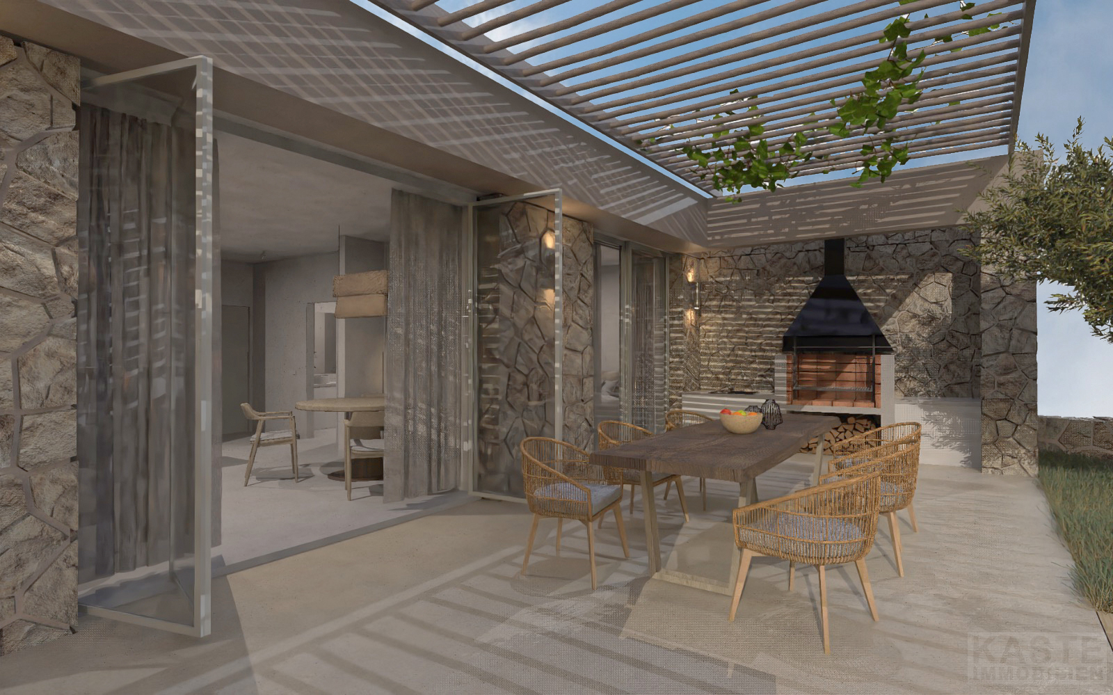 Terrasse und BBQ-Bereich: Die nach Süden ausgerichtete Terrasse mit Pergola bietet den idealen Ort für einen Grillabend unter griechischem Sternenhimmel. Genießen Sie regionale Spezialitäten und einen kretischen Wein in entspannter Atmosphäre, um einen perfekten Strandtag abzurunden.