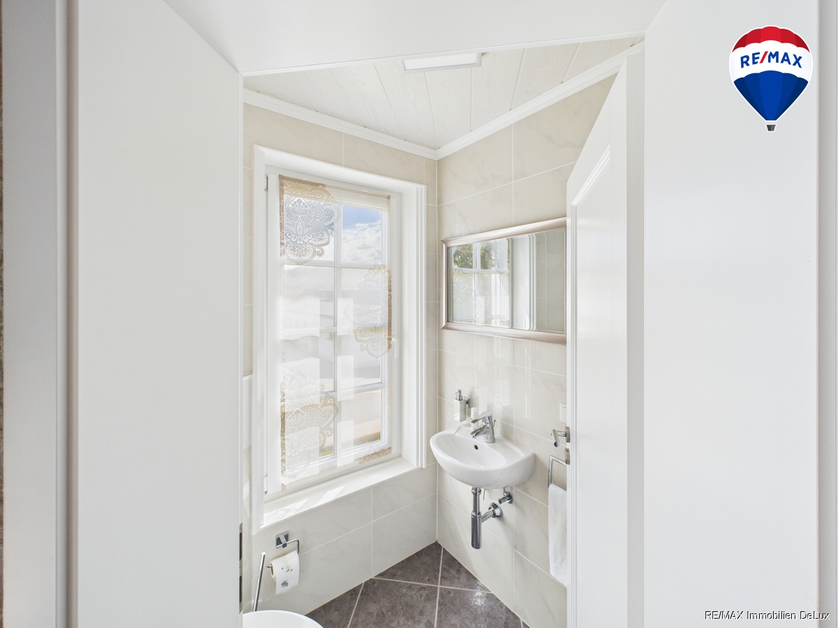 Die gut durchdachte Küche auf der rechten Seite ist mit modernen Geräten ausgestattet und bietet ausreichend Stauraum für all Ihre Kochutensilien. Direkt hinter der Küche führt ein Zugang zur praktischen Waschküche, die zusätzlichen Platz für Ihre Hauswirtschaft bietet. Durch die Waschküche gelangen Sie in ein weiteres, vielseitig nutzbares Zimmer, das als Gästezimmer dient. Ursprünglich als Garage geplant, wurde dieser Raum bereits zu einem komfortablen Gästezimmer umgestaltet.
