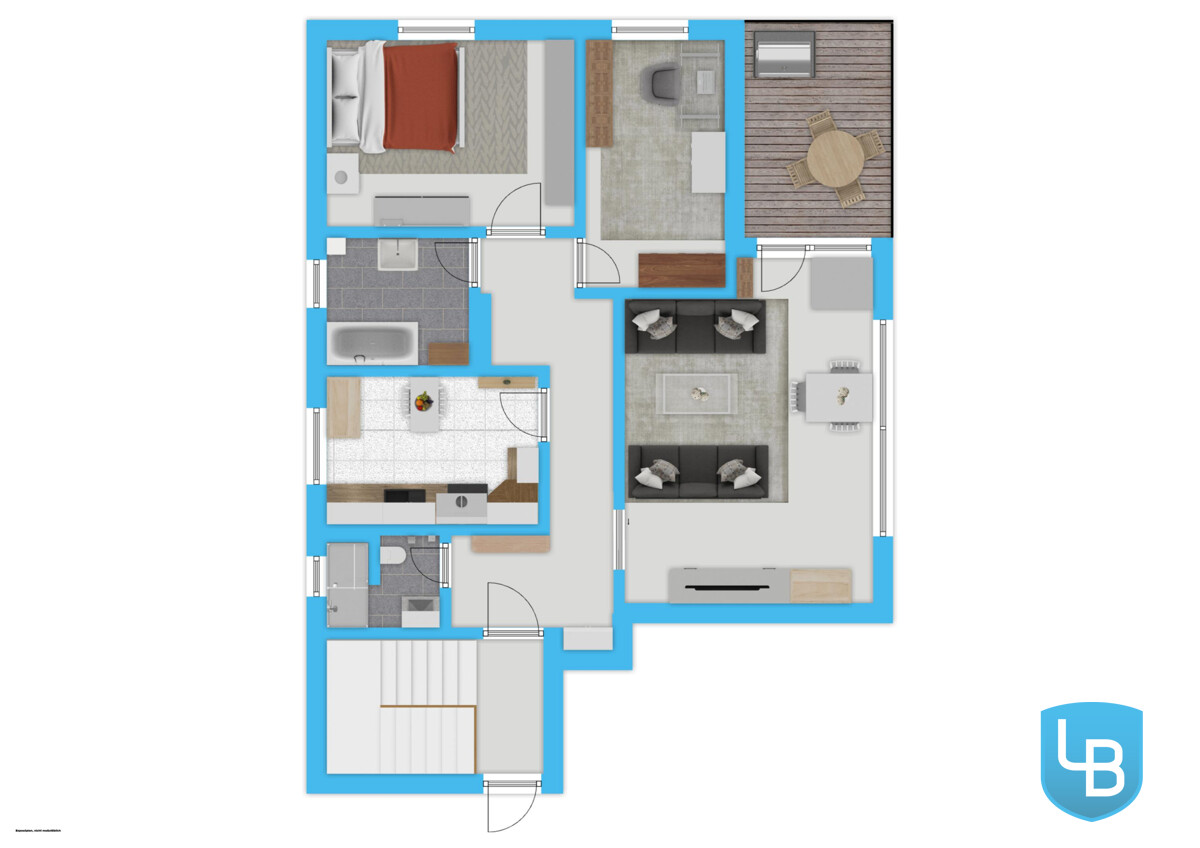 + Flur + Gäste-WC mit Dusche und Fenster + Wannenbad mit Fenster + Voll ausgestattete Küche mit Sitzgelegenheit + Großer Wohn- und Essbereich mit Kamin und Balkonzugang + Geräumiges Schlafzimmer + Weiteres individuell nutzbares Zimmer (Büro / Gäste / Kind)