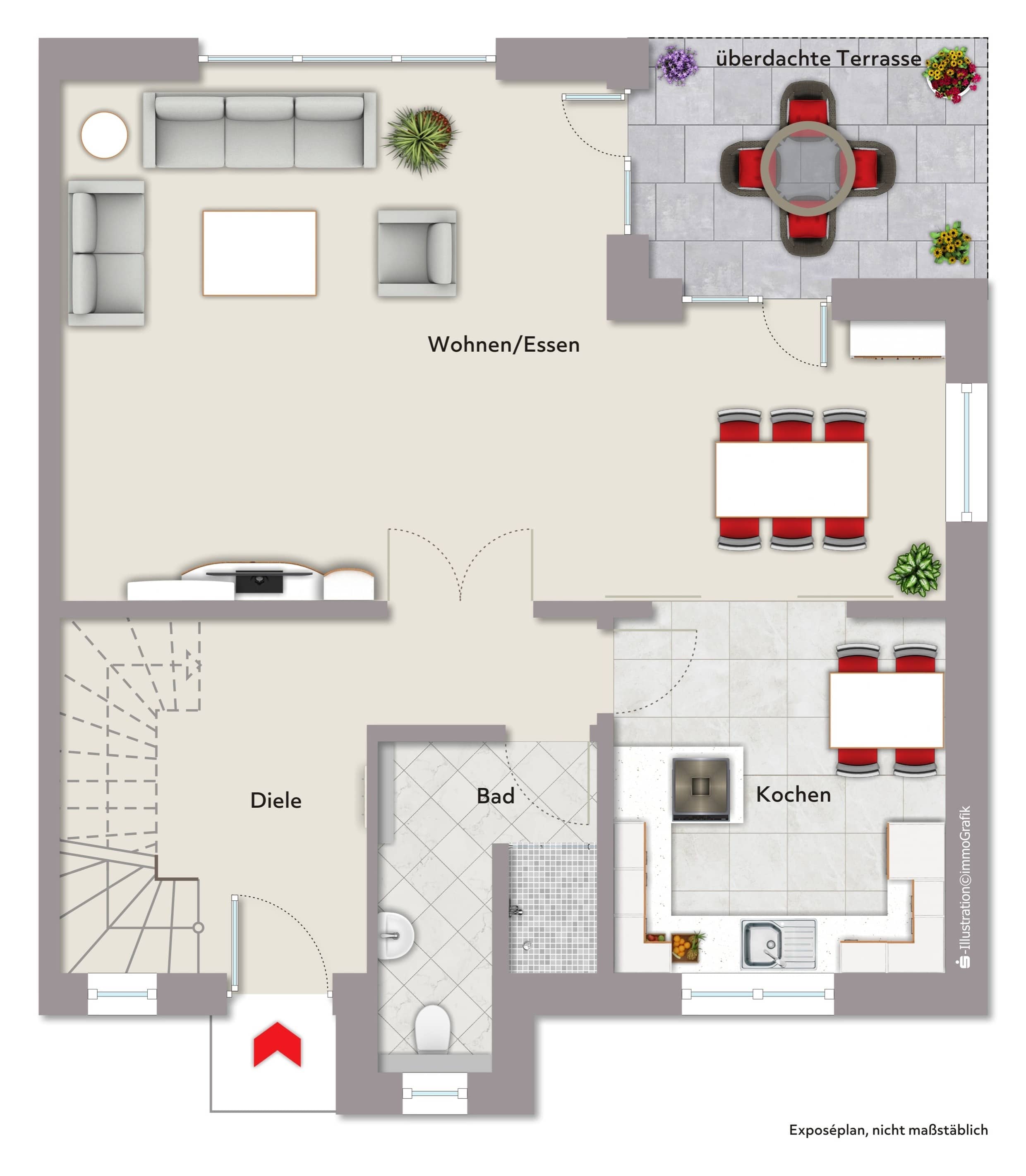 Im Erdgeschoss empfängt Sie eine Diele, von der aus rechts das Duschbad erreichbar ist. Das Herzstück des Hauses bildet das großzügige Wohn- und Esszimmer, das durch seine Offenheit und Helligkeit überzeugt. Von hier aus gelangt man direkt auf die überdachte Terrasse und in den weitläufigen Garten – ein wahres Paradies für Kinder zum Spielen und Toben, aber auch ein idyllischer Ort für gemütliche Stunden im Freien. Die offene Küche fügt sich nahtlos in den Wohnbereich ein und bietet ideale Bedingungen für gemeinsames Kochen und geselliges Beisammensein.