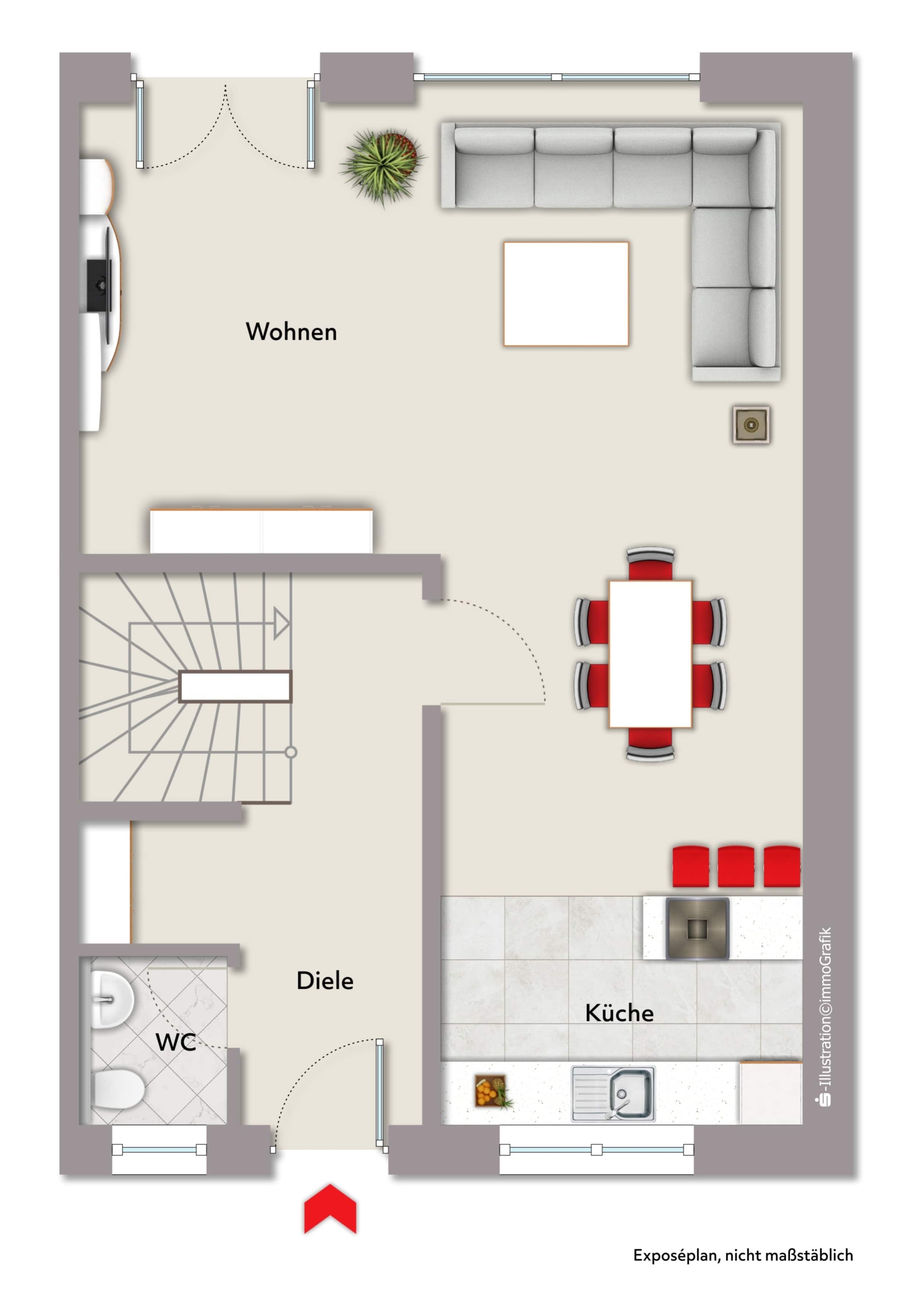 Im Erdgeschoss stehen eine Diele, ein praktisches Gäste-WC sowie ein großzügiger Wohn-/Essbereich mit offener Küche zur Verfügung. Vom Wohnbereich gelangen Sie direkt auf die Terrasse, die zum Entspannen und Verweilen im Freien einlädt. Eine elegante Glastür zwischen Diele und Wohn-/Essbereich schafft eine stilvolle Abgrenzung.