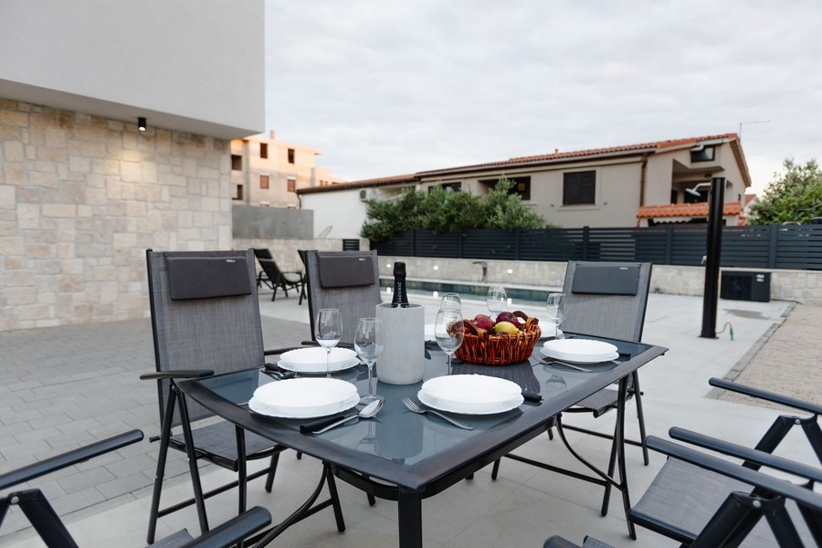 Diese ansprechende Doppelhaushälfte befindet sich in einer bevorzugten Umgebung unweit der Küstenlinie in Mandre auf der Insel Pag, die über eine Brücke mit dem Festland verbunden ist.