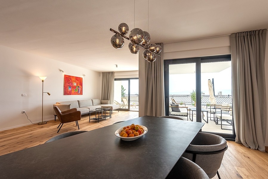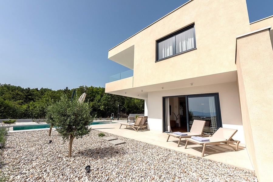 Bei diesem Angebot handelt es sich um eine moderne Doppelhaushälfte mit Swimmingpool und schönem Meerblick in Kostrena bei Rijeka, Kvarner Bucht.