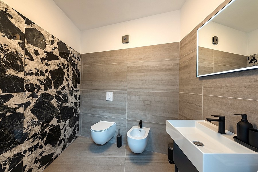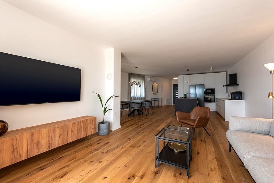 Das Erdgeschoss umfasst eine moderne, voll ausgestattete Küche mit Kochinsel, angrenzend an ein großzügiges Wohnzimmer mit direktem Zugang zur Terrasse und dem anschließenden Pool. Zusätzlich gibt es auf dieser Etage eine Gästetoilette.