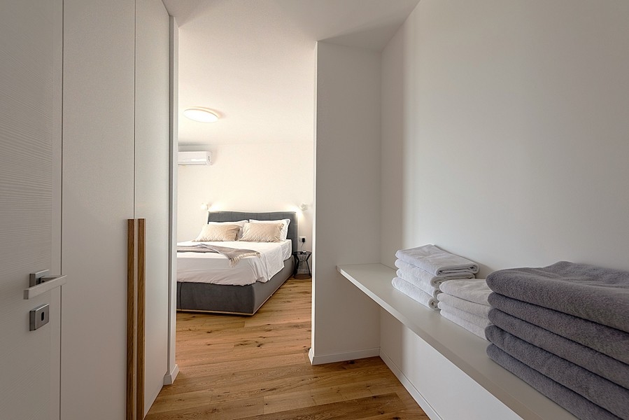 Im Obergeschoss befinden sich drei Schlafzimmer, zwei Bäder sowie zwei nach Süden ausgerichtete Balkone. Das Hauptschlafzimmer verfügt über einen begehbaren Kleiderschrank und ein eigenes Badezimmer.