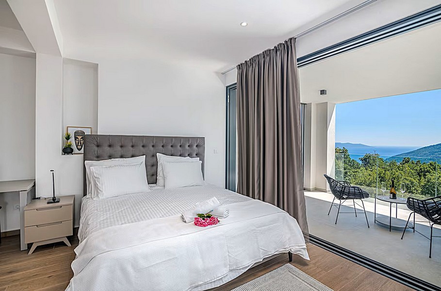 Obere Etage: Drei komfortable Schlafzimmer, davon zwei mit eigenem Bad (en-suite), und ein Balkon, der einen herrlichen Blick auf die Kvarner Bucht bietet.