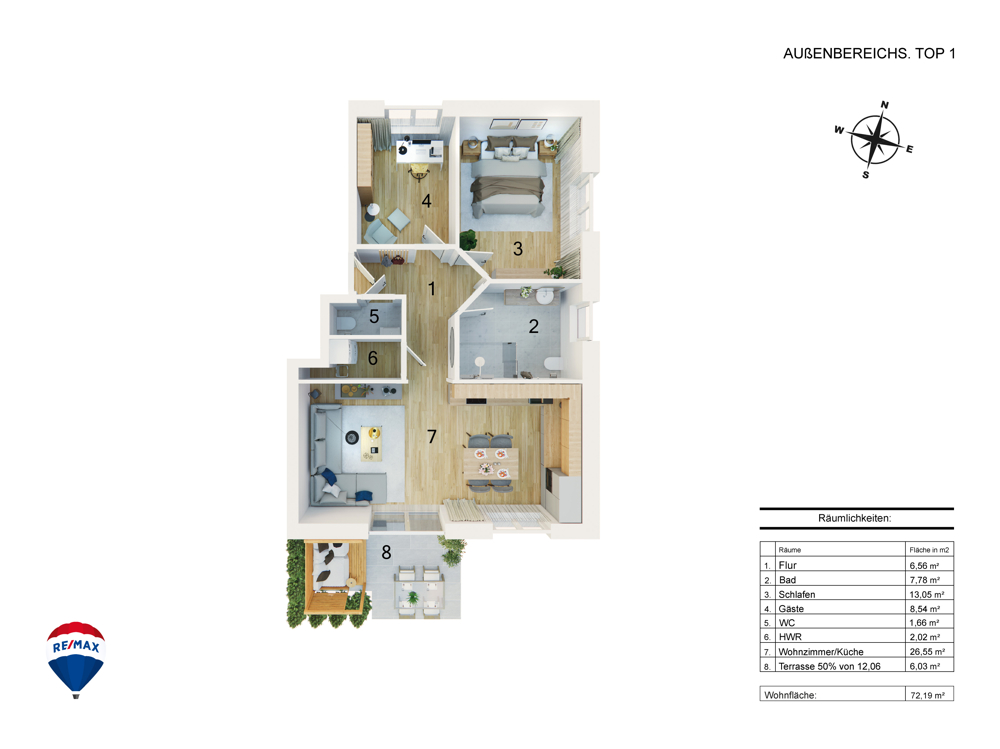 - Terrasse (Südseite): 12,06 m², ideal für Sonnenstunden