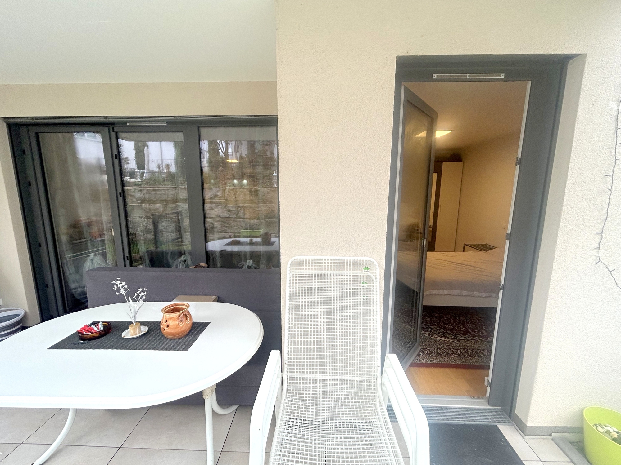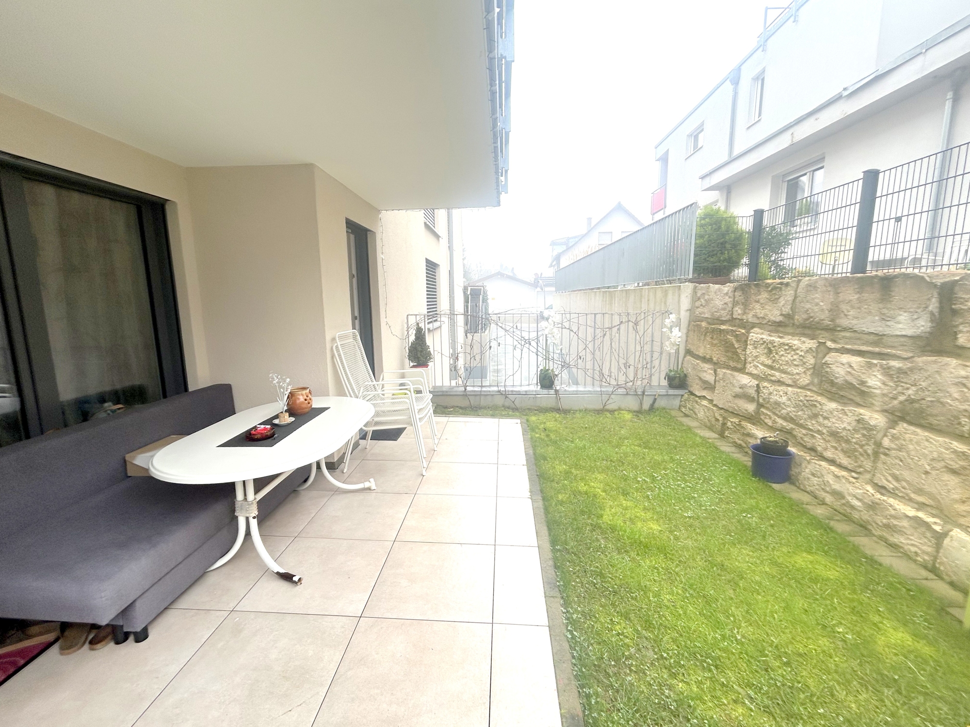 Vom Wohnbereich und Schlafzimmer aus gelangen Sie direkt auf die Terrasse und in den Gartenanteil, Ein zeitgemäß ausgestattetes Badezimmer ergänzt das Raumangebot.
