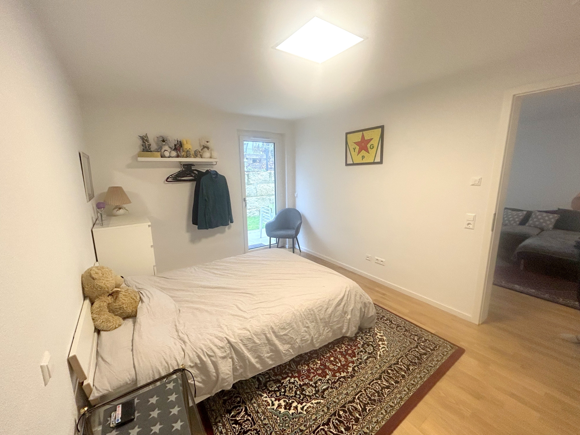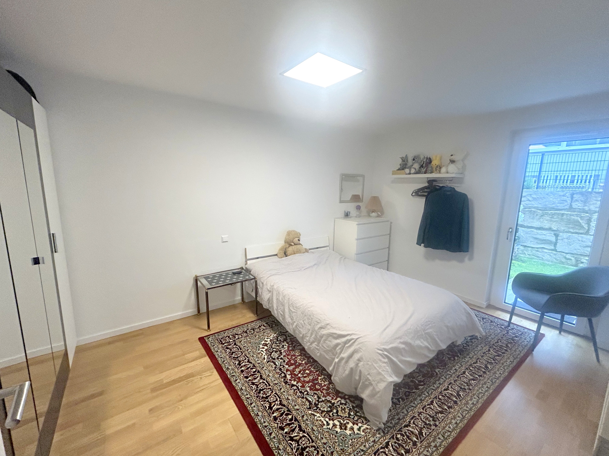 Das Schlafzimmer ist gut geschnitten und ebenfalls mit einem direkten Zugang nach draußen ausgestattet. Dadurch entsteht ein angenehmer Bezug zum Außenbereich, der sich im Alltag besonders praktisch zeigt.