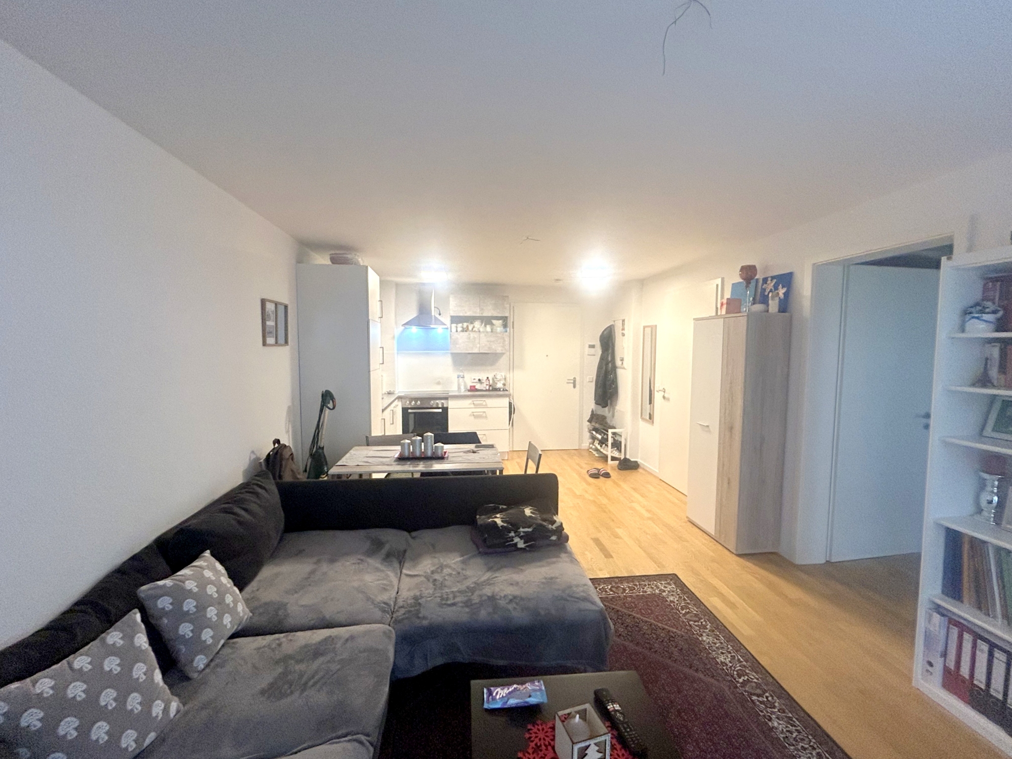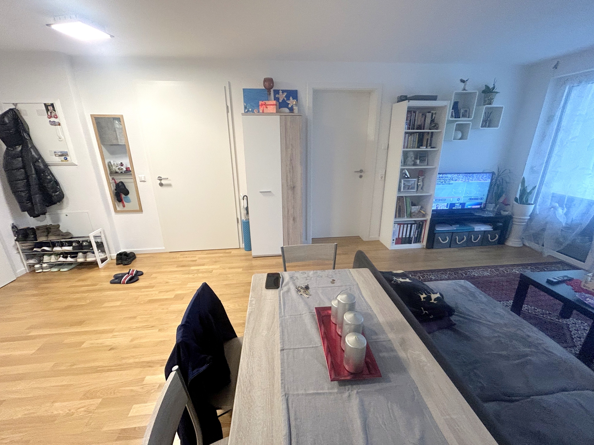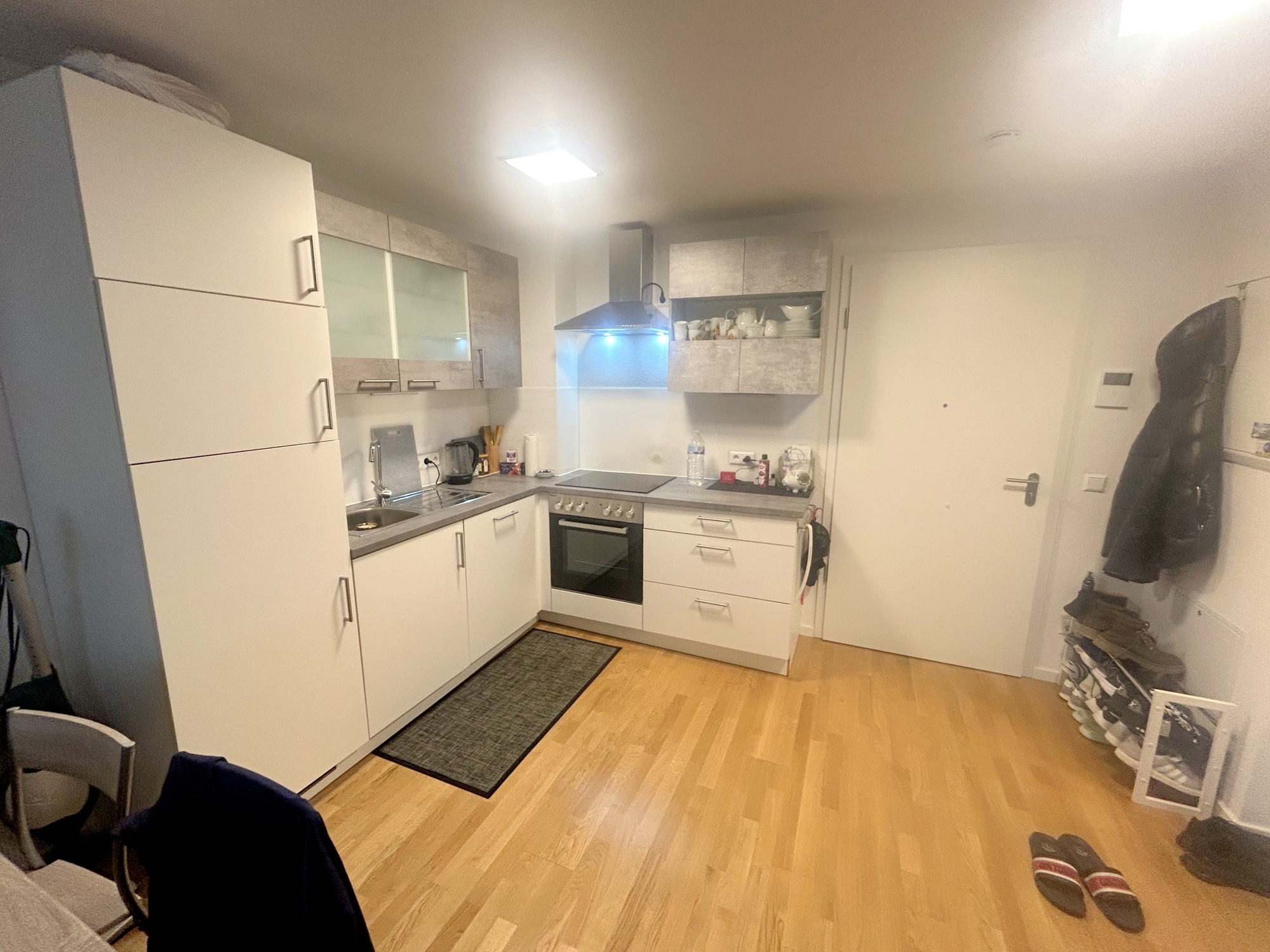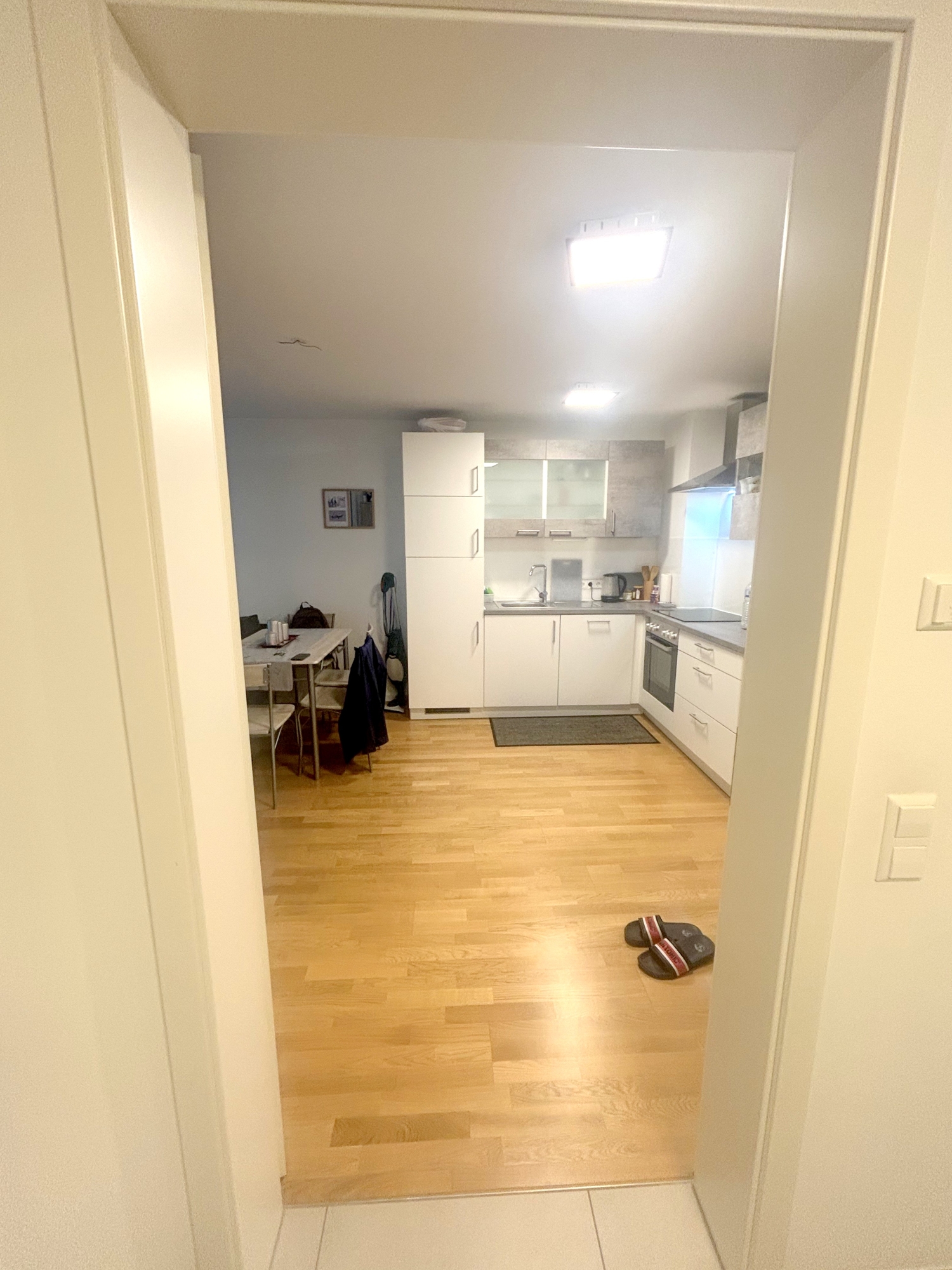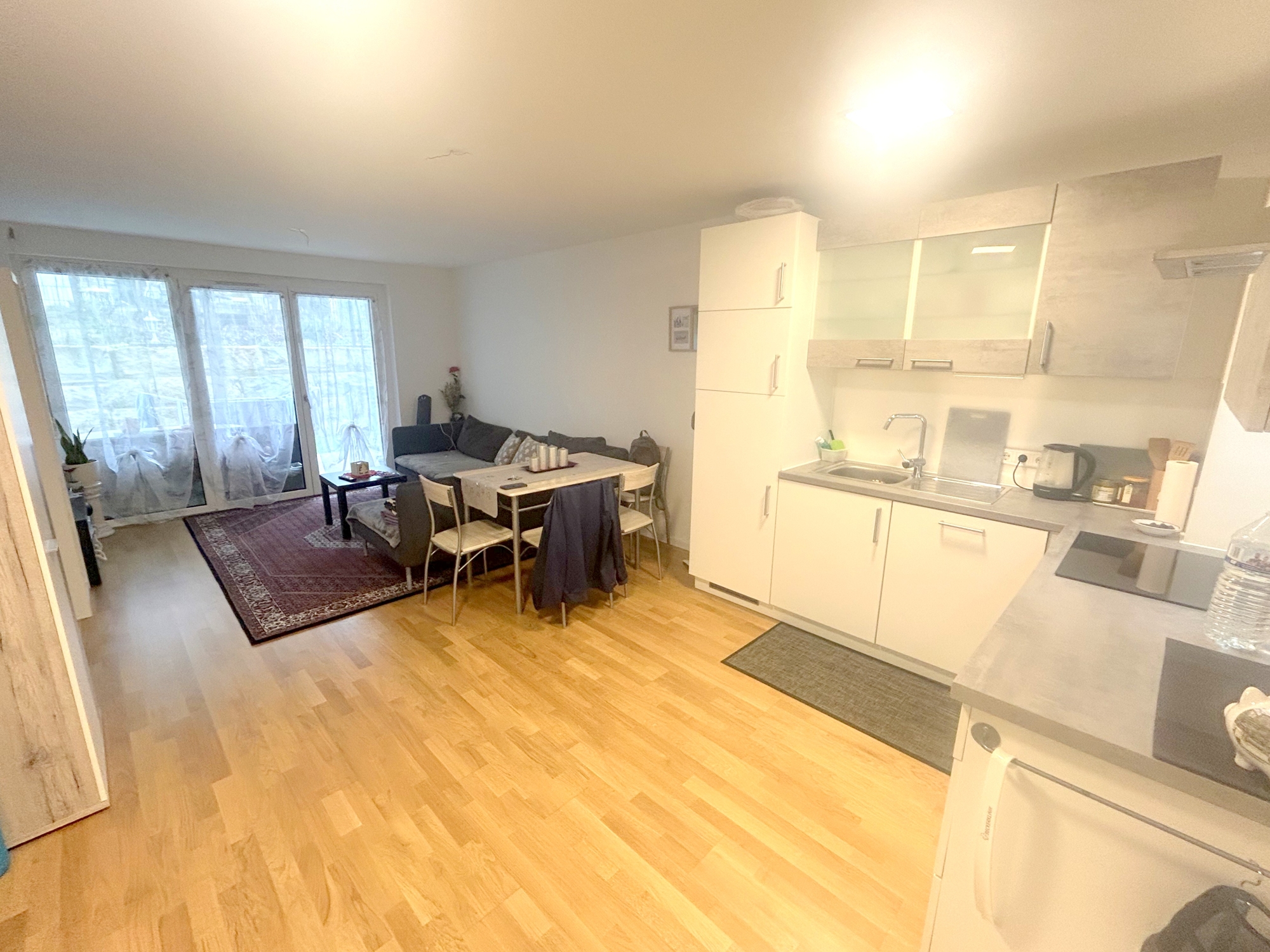 Beim Eintreten gelangen Sie in den Flur, von dem aus sich die Wohnung übersichtlich erschließt. Herzstück ist der offen gestaltete Wohn und Essbereich mit integrierter Einbauküche. Die Küche ist in L Form angeordnet und bietet einen geräumigen Arbeitsbereich. Der Wohnbereich öffnet sich über große, bodentiefe Elemente zur überdachten Terrasse und in den kleinen Gartenanteil. Hier ist Platz für Sitzmöbel, Grill oder einfach für entspannte Stunden im Freien.