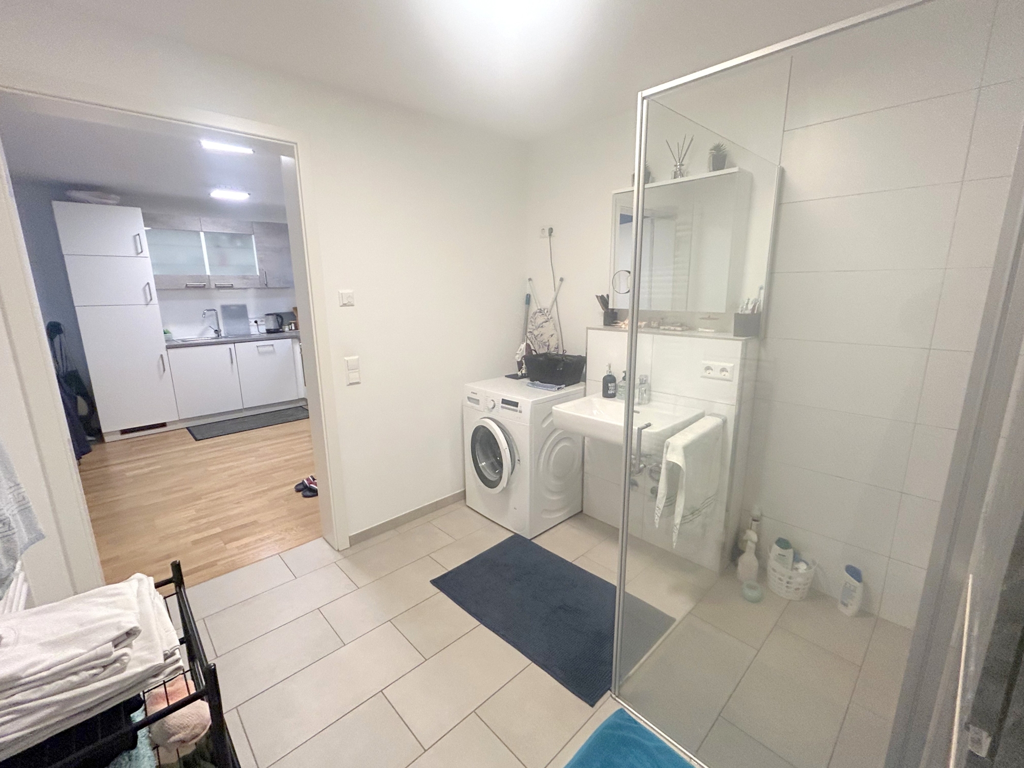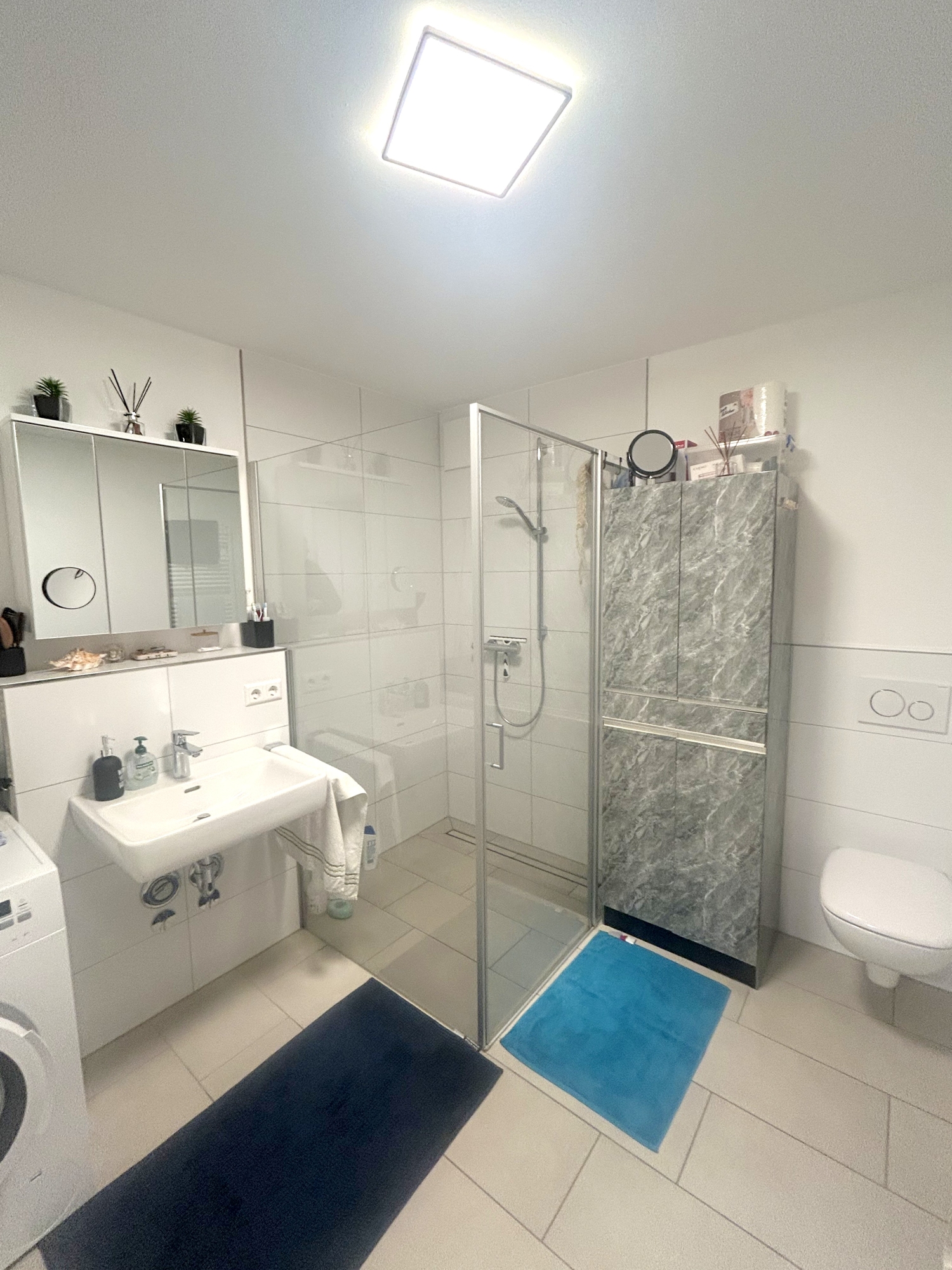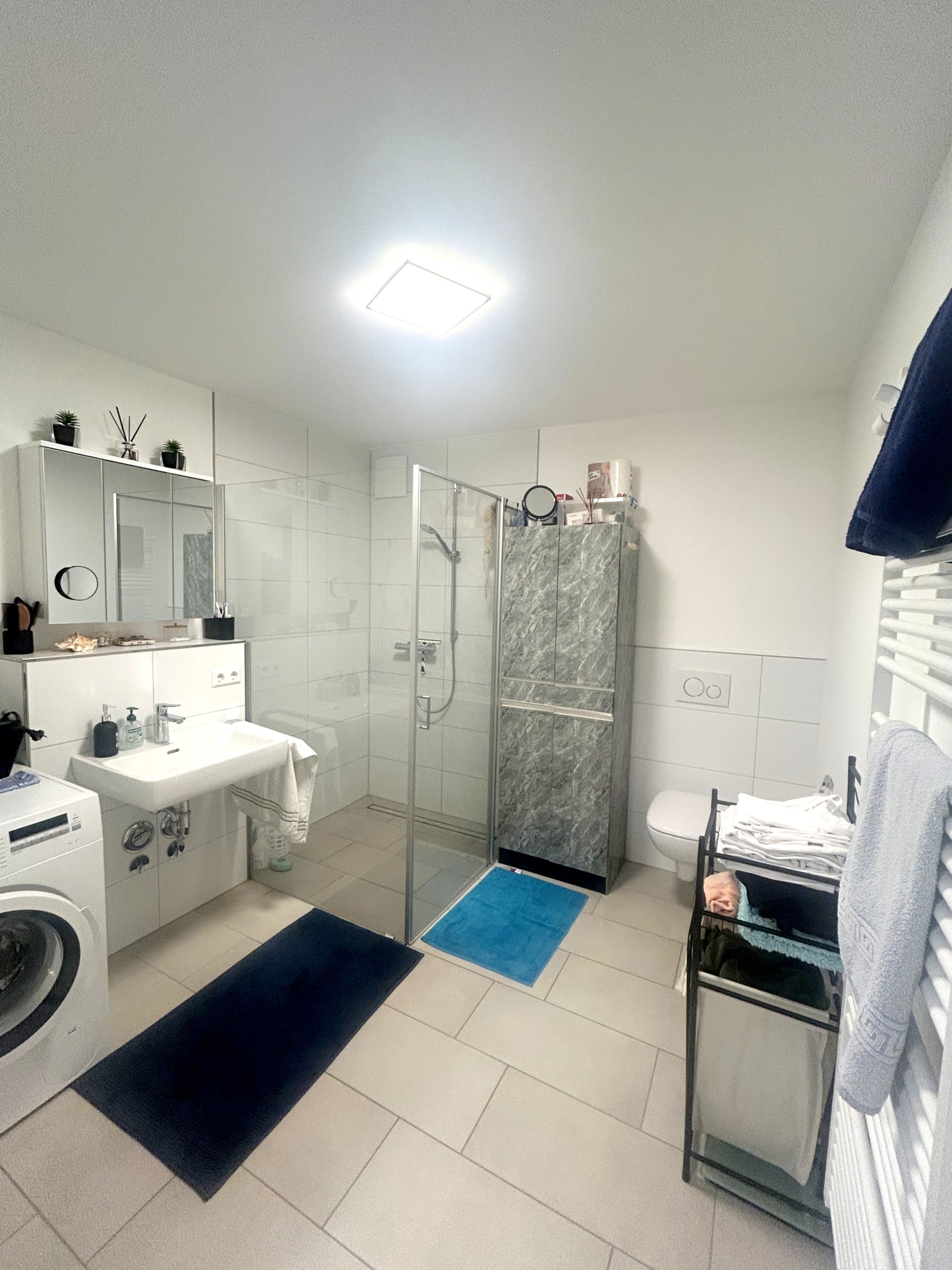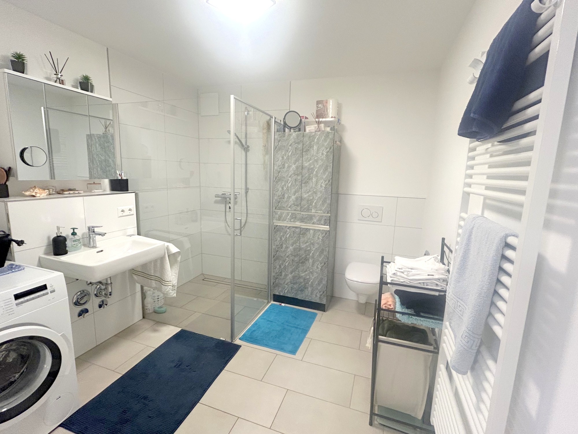 Das Badezimmer präsentiert sich zeitgemäß mit großformatiger, heller Fliese, bodengleicher Dusche mit Glasabtrennung, wandhängendem WC und Handtuchheizkörper. Ein Waschmaschinenanschluss ist vorhanden, was den Alltag zusätzlich erleichtert.