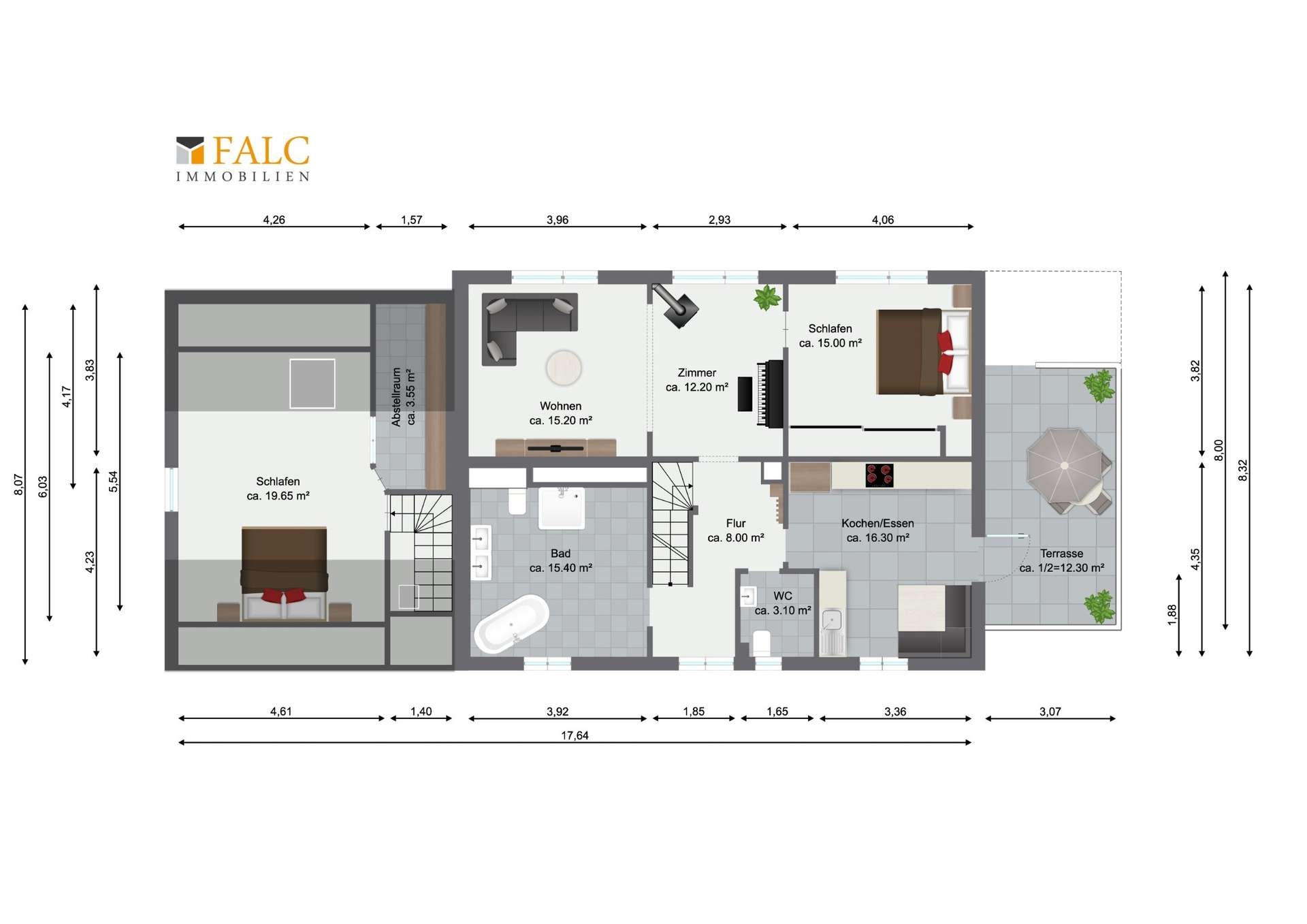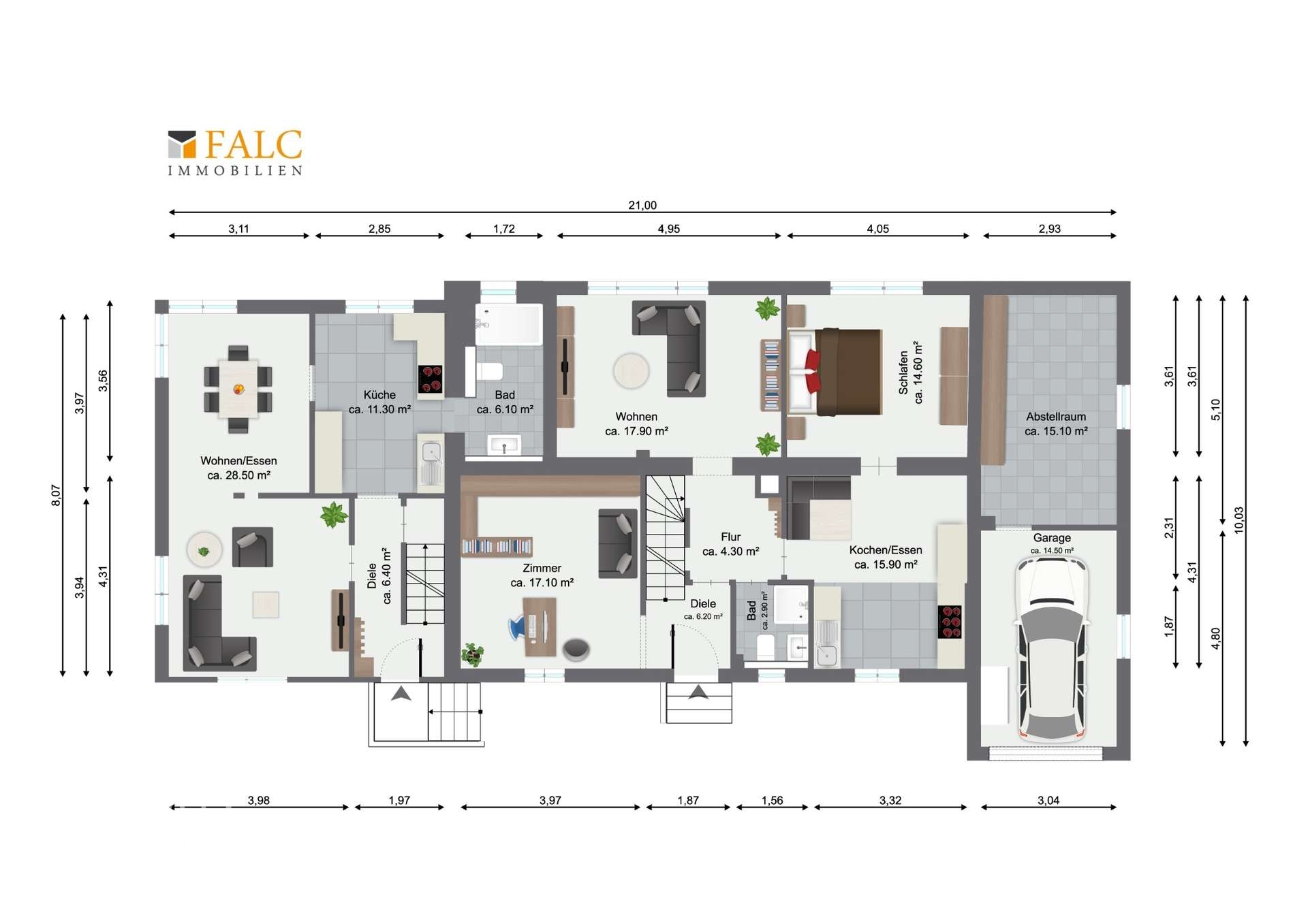 Einliegerwohnung im Erdgeschoss Im Erdgeschoss des Haupthauses befindet sich zudem eine separate Einliegerwohnung mit rund ca. 59,80 m² Wohnfläche. Sie umfasst ein Wohnzimmer, eine geräumige Küche, ein Schlafzimmer, ein Badezimmer sowie eine Diele und eignet sich ideal als eigenständige Einheit für Gäste, Familienmitglieder oder sogar zur Vermietung. Beide Wohneinheiten sind über einen gemeinsamen Hauseingang erreichbar. Ein ca. 17,10 m² großer Dielenbereich bietet dabei ausreichend Platz für Garderobe und Stauraum und schafft einen komfortablen Empfangsbereich.
