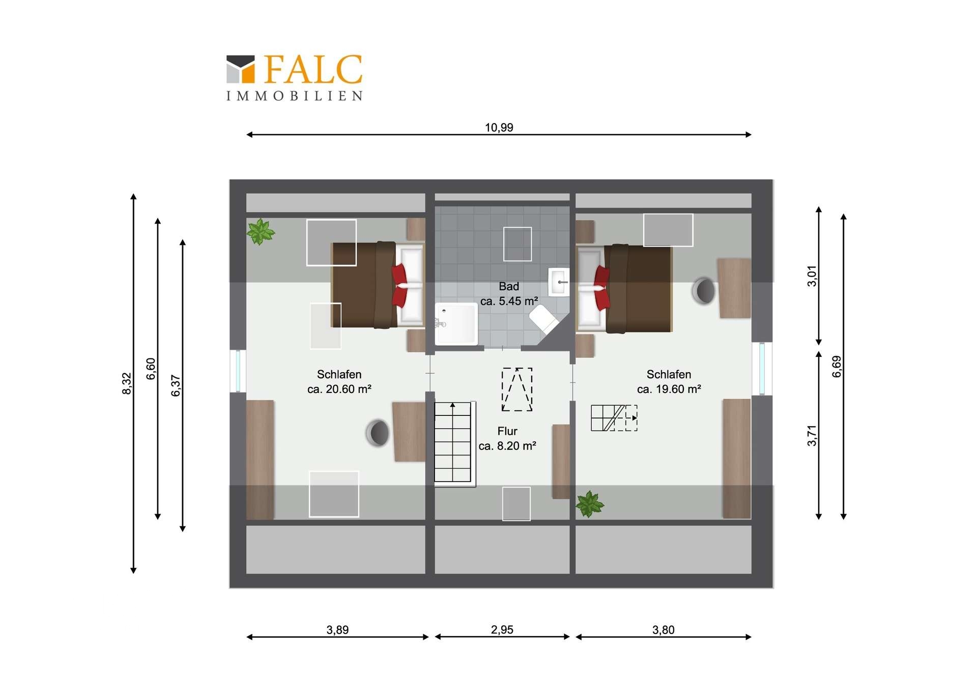 - Einliegerwohnung im Erdgeschoss (ca. 59,8 m²): 2 Zimmer + Küche, Diele und Tageslichtbad