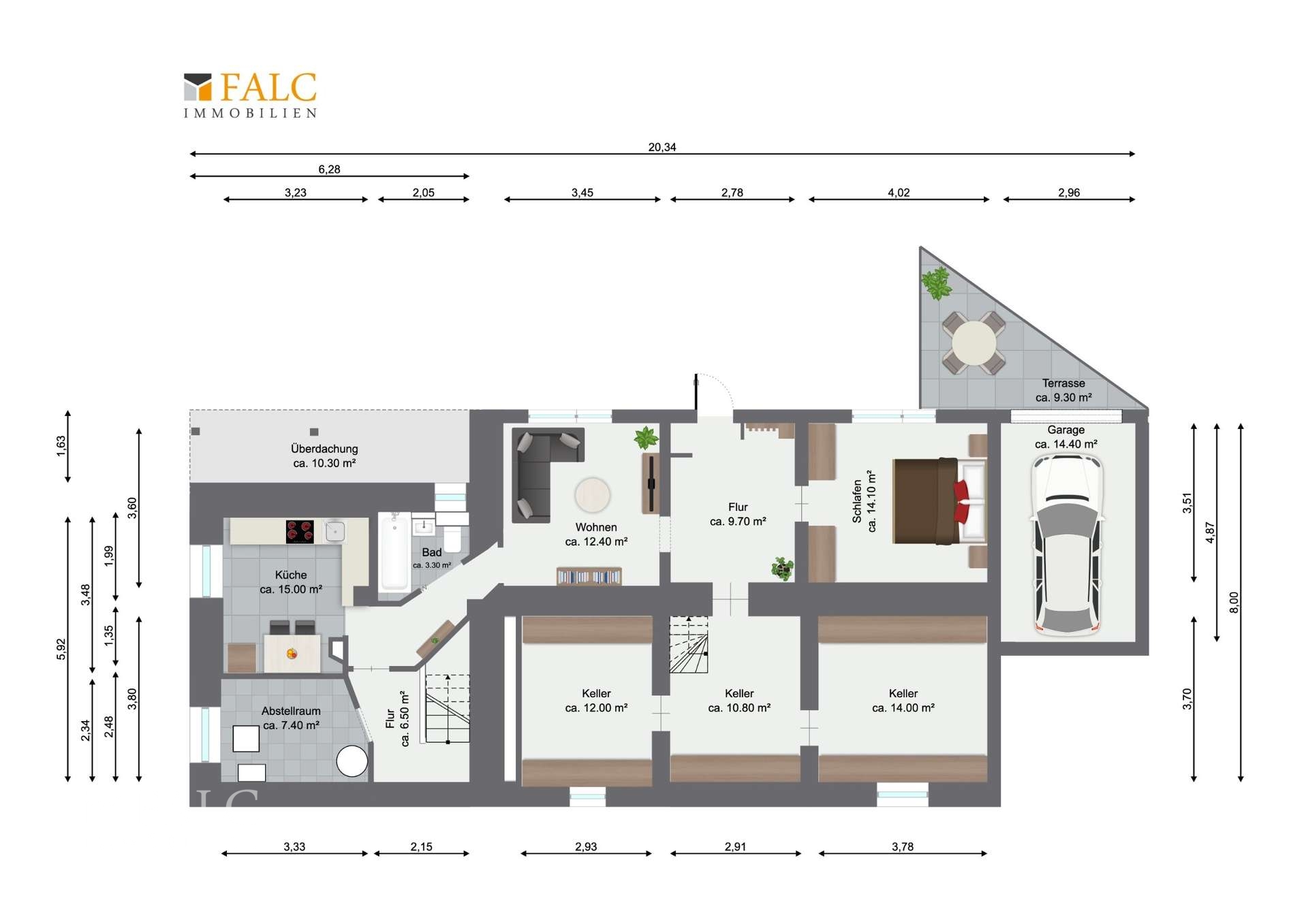 - Außenbereiche: Überdachte Terrasse vor dem Haus – ideal für gesellige Stunden im Freien Separater Garten für den Souterrain-Bereich Zusätzliche Gartenfläche in sonniger Süd-West-Lage – perfekt für Familie, Haustiere oder Hobbygärtner