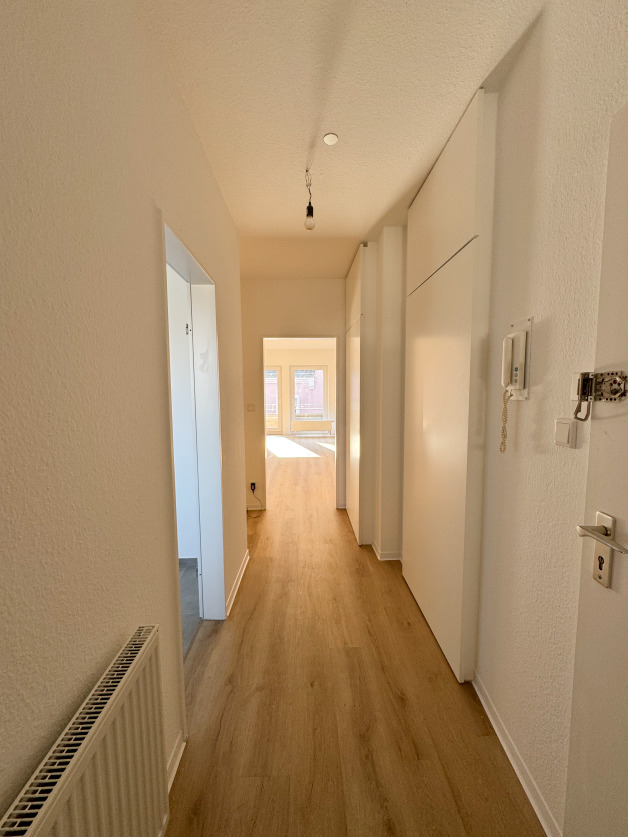 Im 3. Obergeschoss erwartet Sie der Eingangsbereich mit Flur, einem praktischen Gäste-WC und einer Küche. Der großzügige Wohn- und Essbereich ist besonders hell und bietet Zugang zu einem kleinen Balkon, der den Raum mit frischer Luft und Aussicht bereichert.