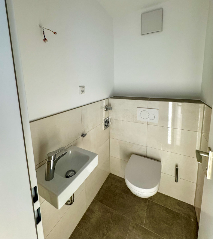 Die hochwertige Ausstattung unterstreicht den modernen Charakter dieser Wohnung. In den Wohnräumen sorgt ein eleganter Vinyl-Designboden für ein warmes und stilvolles Ambiente, während die Wendeltreppe zum Schlafzimmer mit einem komfortablen Teppichboden versehen ist, der auch für Trittsicherheit sorgt. Das Badezimmer wurde mit einer großzügigen Dusche und edlen Fliesen in modernem Design renoviert, ebenso wie das Gäste-WC, das ebenfalls mit pflegeleichten, großformatigen Fliesen ausgestattet ist.