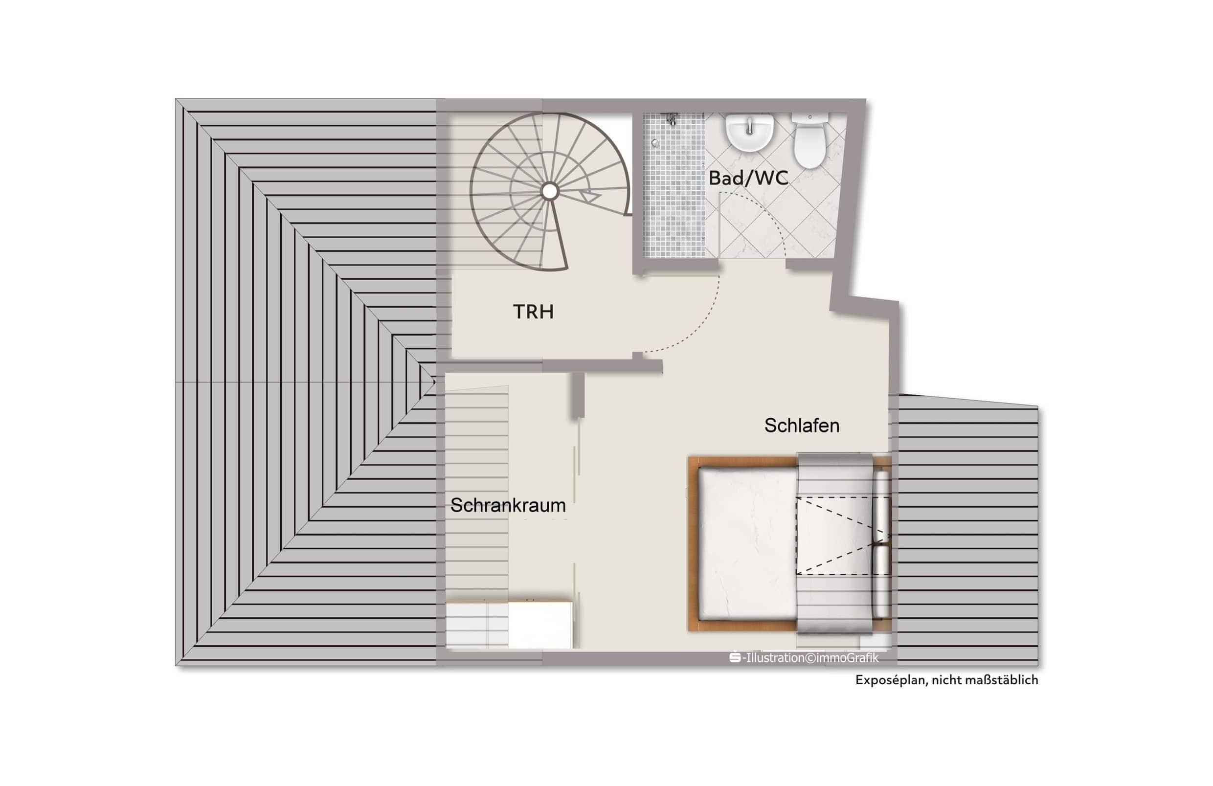Über eine elegante Wendeltreppe gelangen Sie in die 4. Etage, wo Sie das Schlafzimmer und das zeitgemäß gestaltete Badezimmer mit bodentiefer Dusche finden. Die Aufteilung der Wohnung vermittelt ein fast hausähnliches Gefühl und sorgt gleichzeitig für eine ruhige, private Atmosphäre.