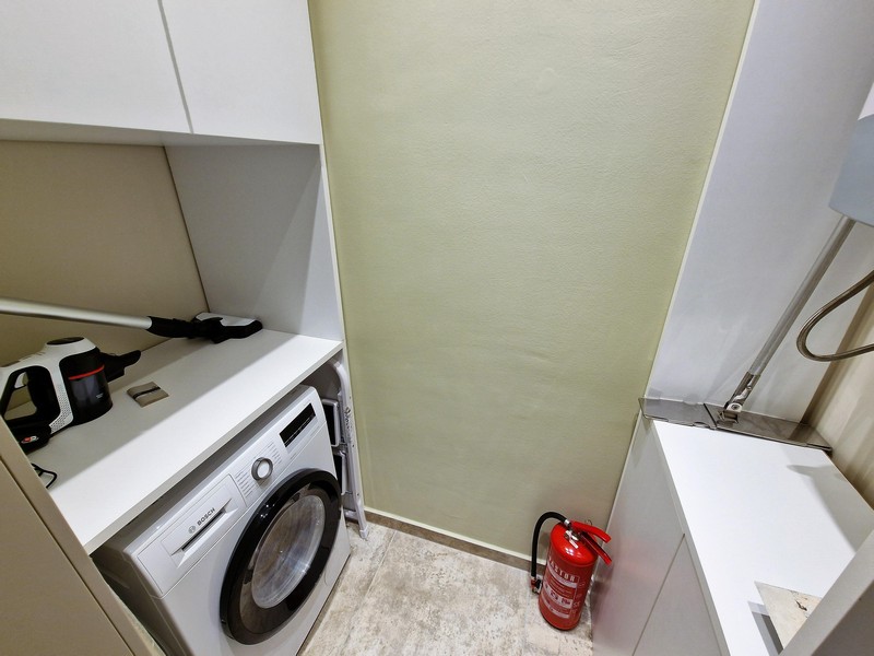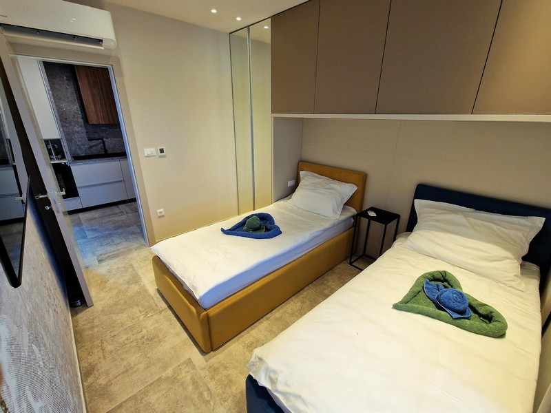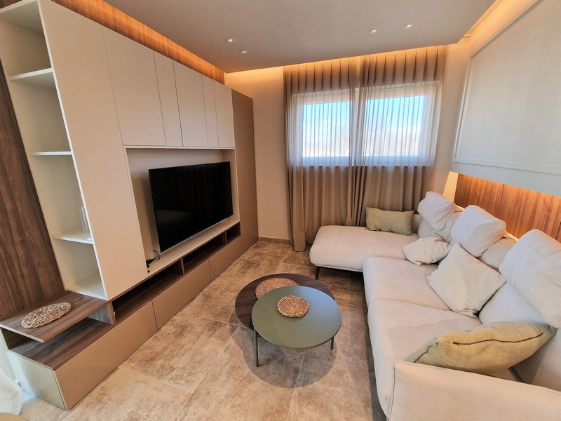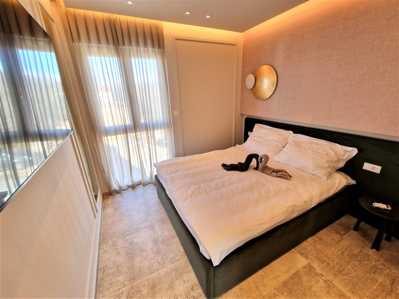 Vom ersten Stockwerk gelangt man zur Dachterrasse mit Swimmingpool und schönem Meerblick. Die Wohnung ist hochwertig möbliert und sie verfügt über Klimatisierung, Fußbodenheizung und zwei Stellplätze.