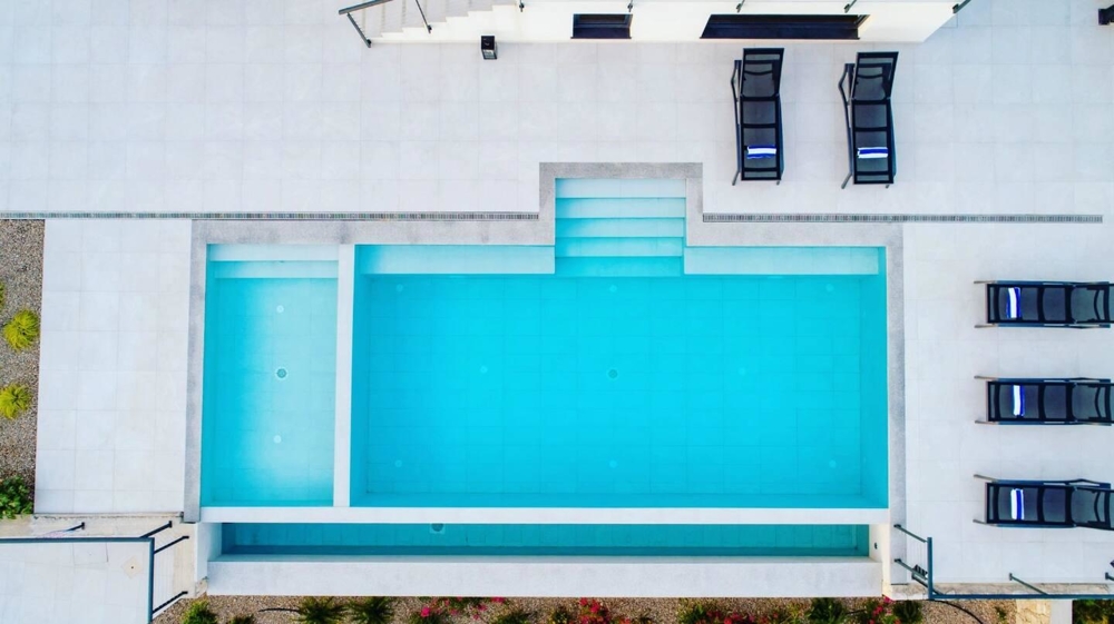 Im Außenbereich befinden sich ein beleuchteter Infinity-Swimmingpool mit Sonnenterrasse und Panorama-Meerblick, eine überdachte Terrasse mit Barbecue Grill sowie sechs Stellplätze vor der Villa.