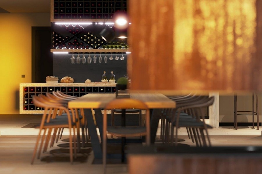 Untere Etage: Wohnzimmer mit Küche und Essbereich, Gäste-WC, Abstellraum, Schlafzimmer und Badezimmer