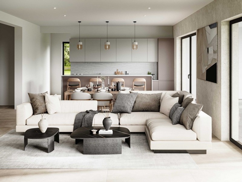Im Erdgeschoss befinden sich ein großzügiges Wohnzimmer, eine Küche und ein Esszimmer, eine Wellnessecke zum Entspannen, ein Technikraum, eine Waschküche und eine Gästetoilette.