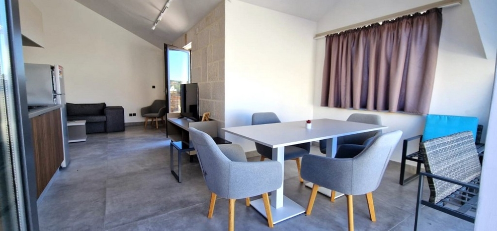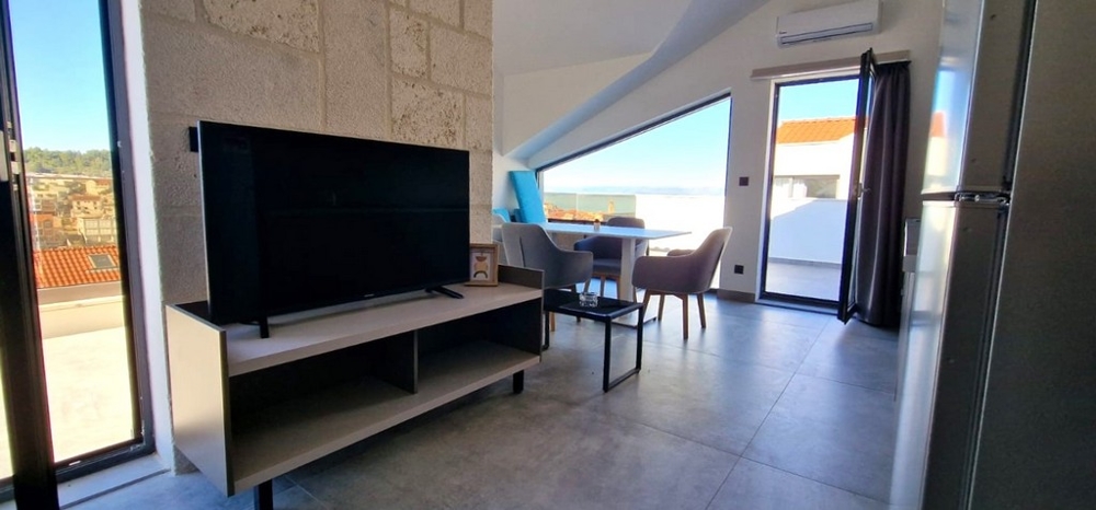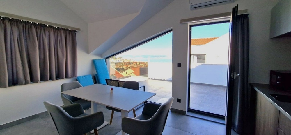 Die Wohnung besteht aus zwei Schlafzimmern (eines davon mit einer Galerie), zwei Badezimmern, einem Flur, einem Eingangsbereich und einem offenen Wohnzimmer mit Küche und Essbereich. Das Wohnzimmer ist großzügig gestaltet und öffnet sich zu den weitläufigen Terrassen, die einen wunderschönen Blick auf die Stadt und das Meer bieten. Die Wohnung ist stilvoll möbliert, gut ausgestattet, klimatisiert und somit sofort bewohnbar. Darüber hinaus steht Ihnen ein Außenstellplatz direkt vor dem Eingang des Wohngebäudes zur Verfügung.