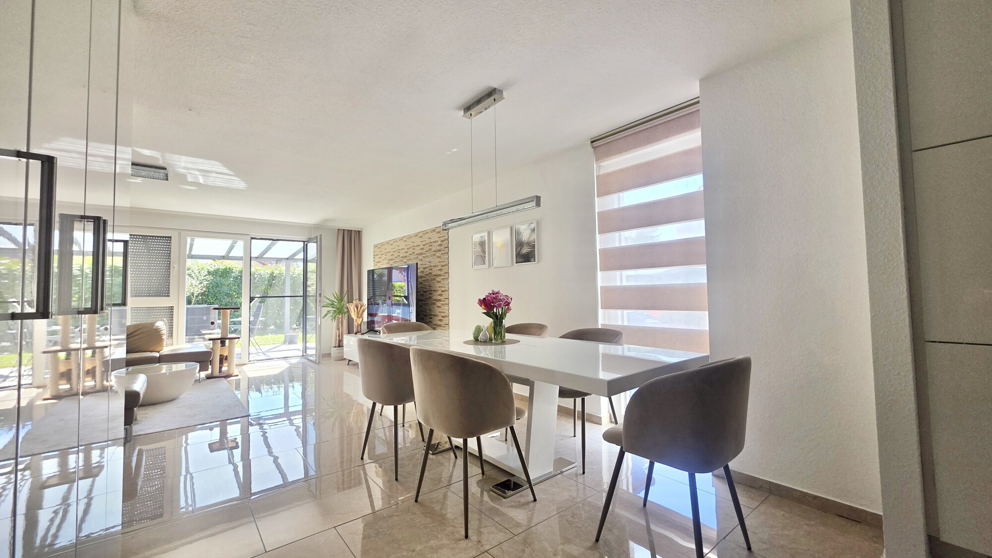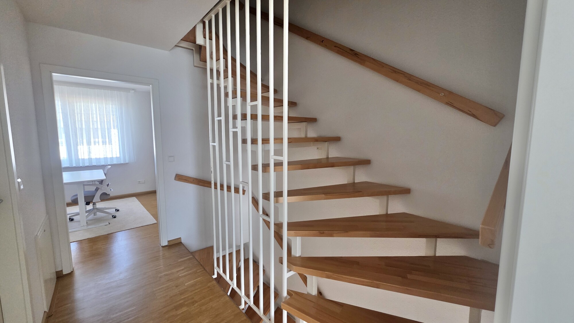Die Böden sind mit Fliesen im EG und hochwertigem Echtholzparkett in den Zimmern im OG u. DG ausgestattet. Die Fenster sind zum Teil bodentief u. zweifach isolierverglast.