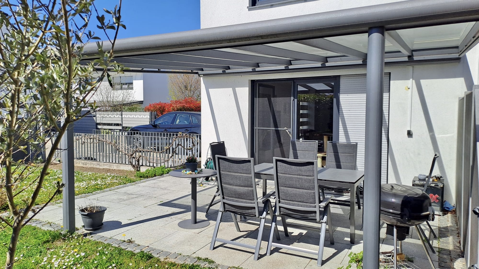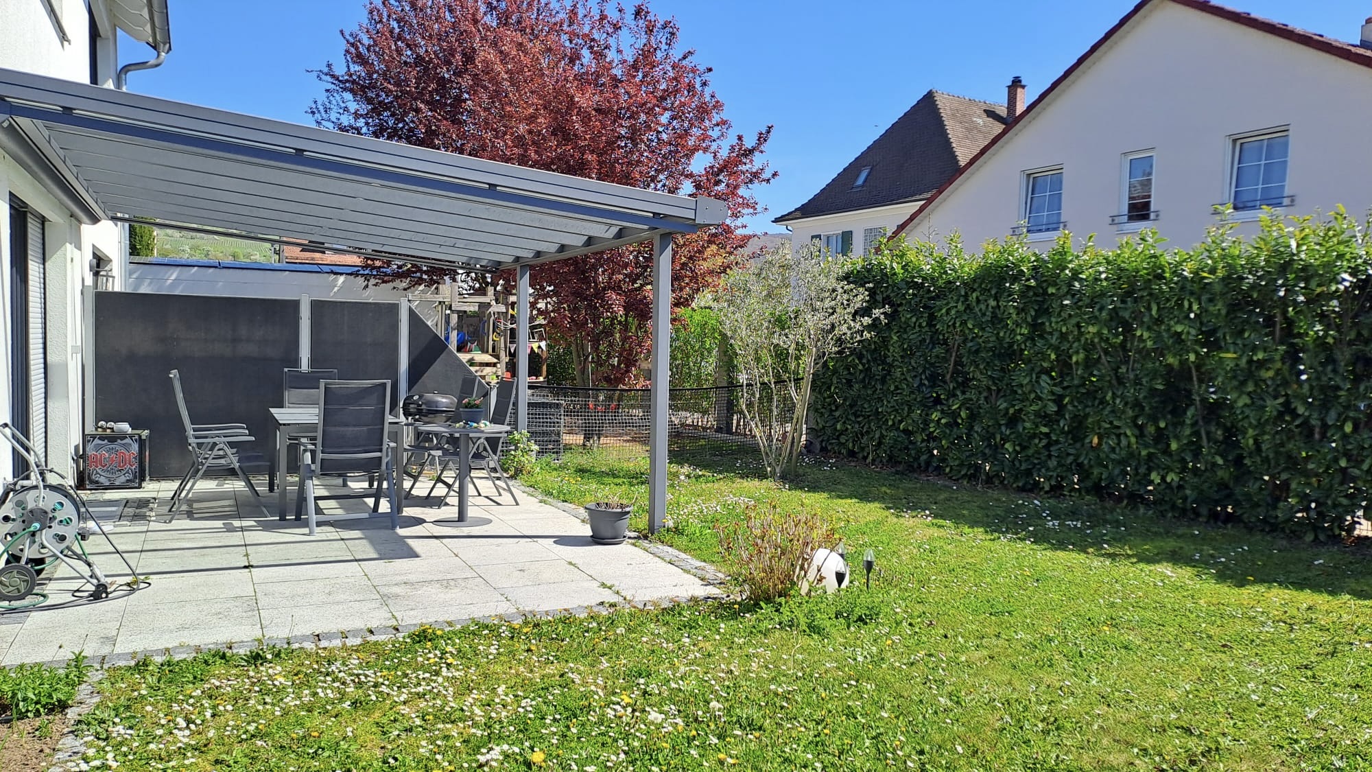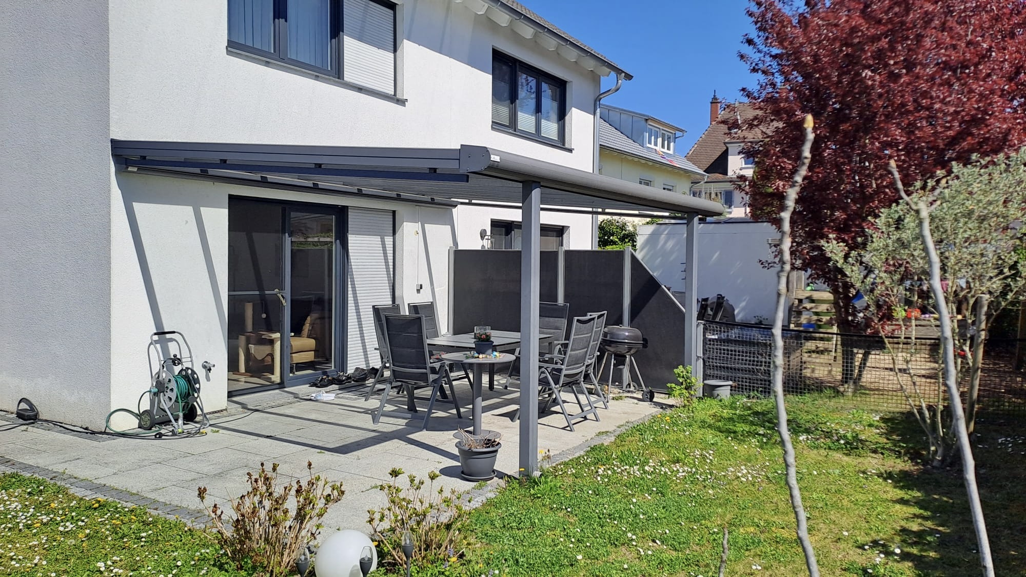 Vom Wohnbereich aus gelangen Sie auf die große, überdachte Terrasse mit Süd Ausrichtung, als erweiterter Wohnraum im Freien, mit Blick in den schönen Garten hinter dem Haus.