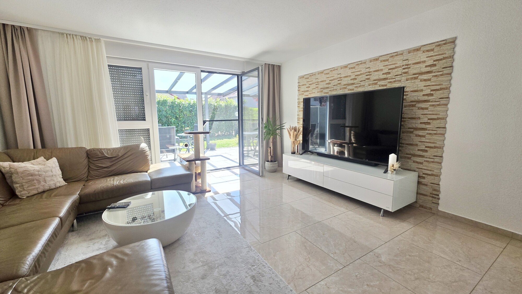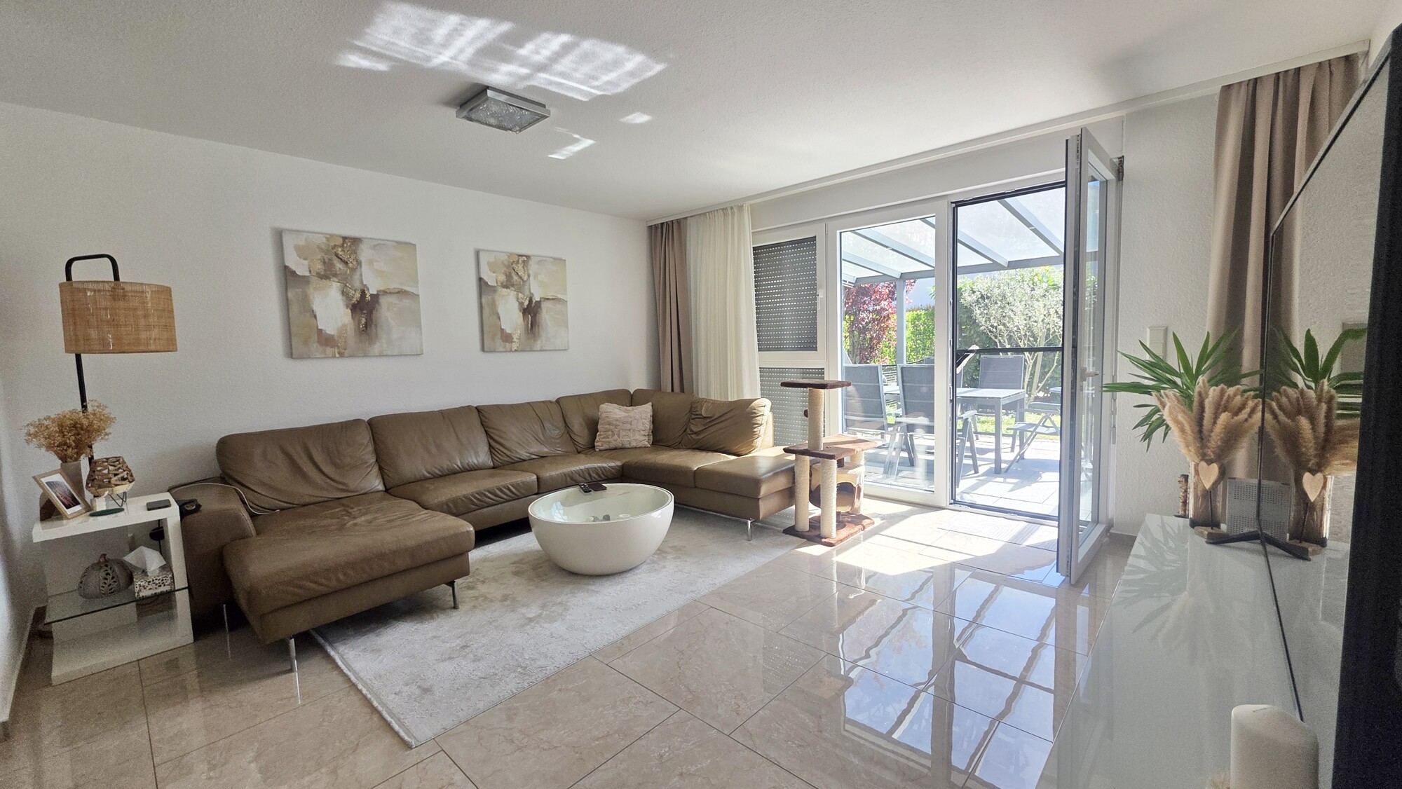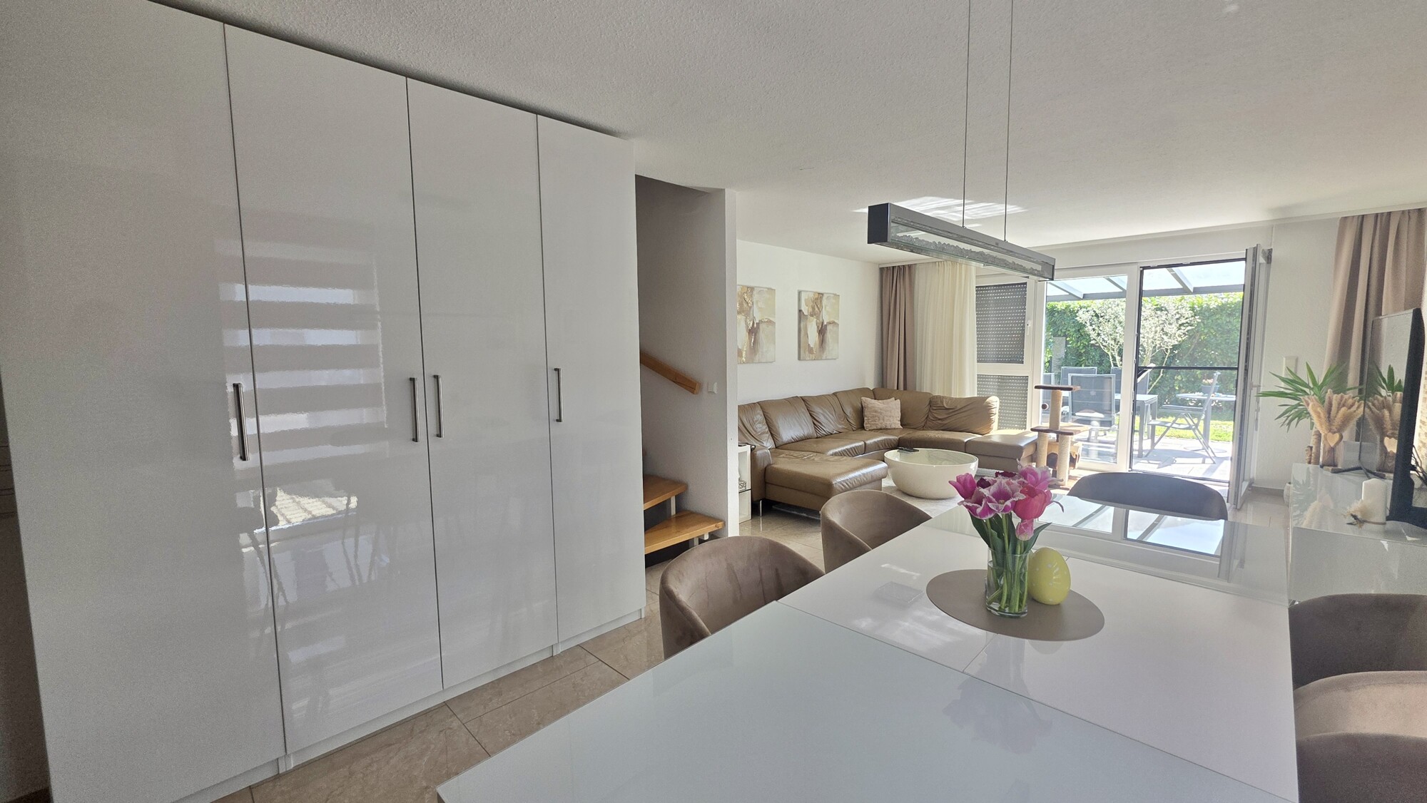 Vom Wohnbereich aus gelangen Sie auf die große, überdachte Terrasse mit Süd Ausrichtung, als erweiterter Wohnraum im Freien, mit Blick in den schönen Garten hinter dem Haus.