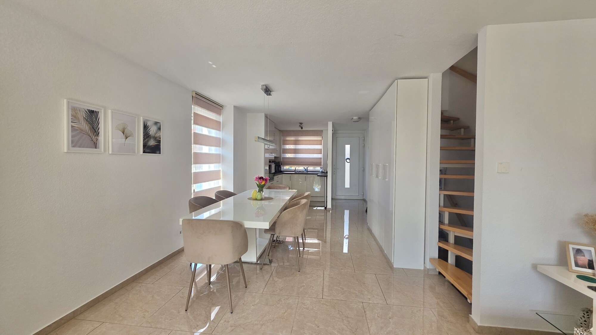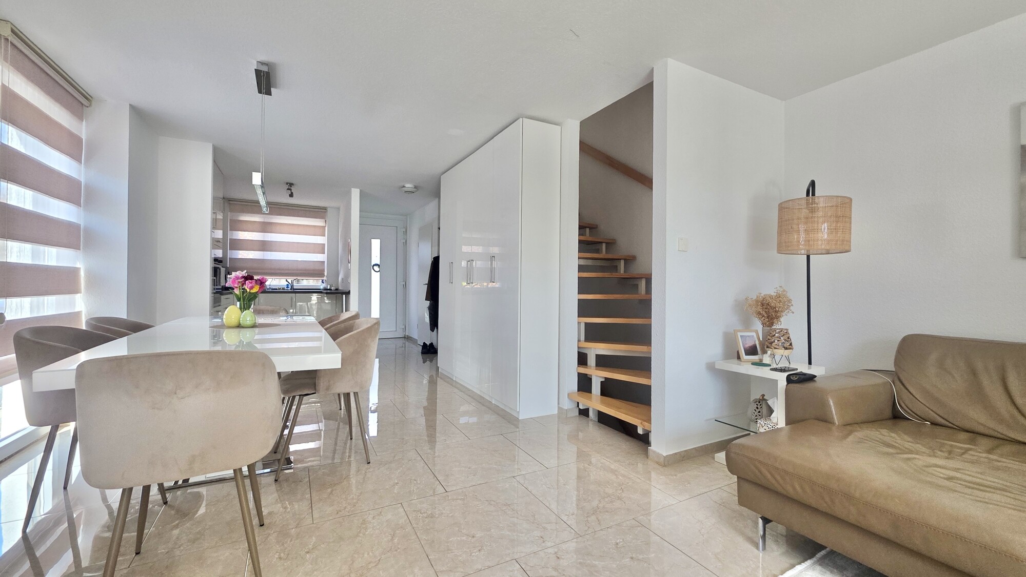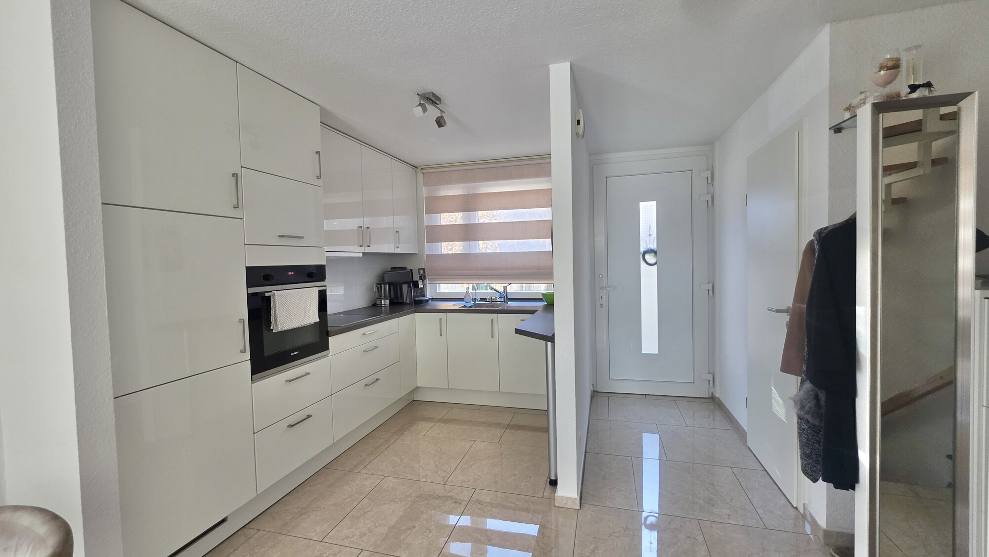Der offen gestaltete, lichtdurchflutete Wohnbereich im EG mit Eingangsbereich und Garderobe überzeugt durch großzügige Proportionen u. angenehmem Wohnambiente, das durch eine offene Küche mit hochwertiger EBK, mit Lackhochglanzfront u. Markengeräten (Siemens) abgerundet wird.