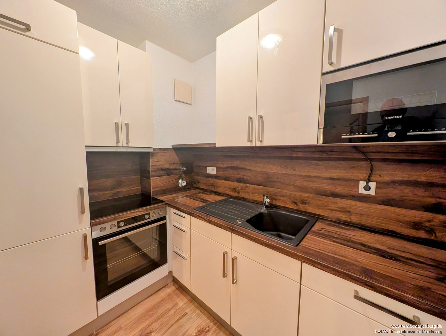 Die erneuerte Einbauküche verfügt über eine vollständige, gut zugängliche Ausstattung mit Geschirrspüler, Cerankochfeld mit Backofen, Kühl- und Gefrierkombination, Mikrowelle sowie Spüle und ermöglicht komfortables Kochen im Alltag.
