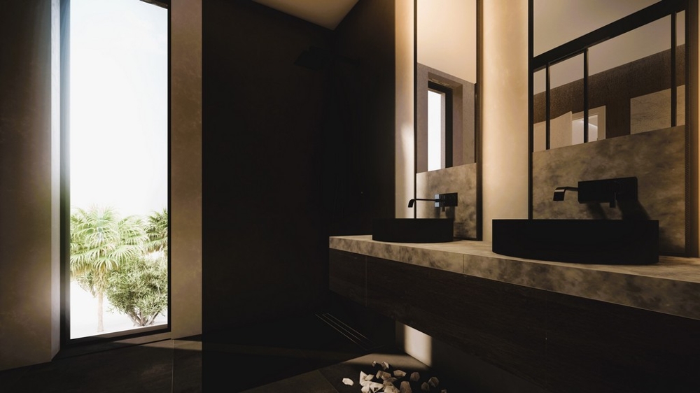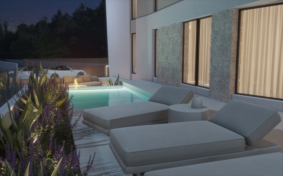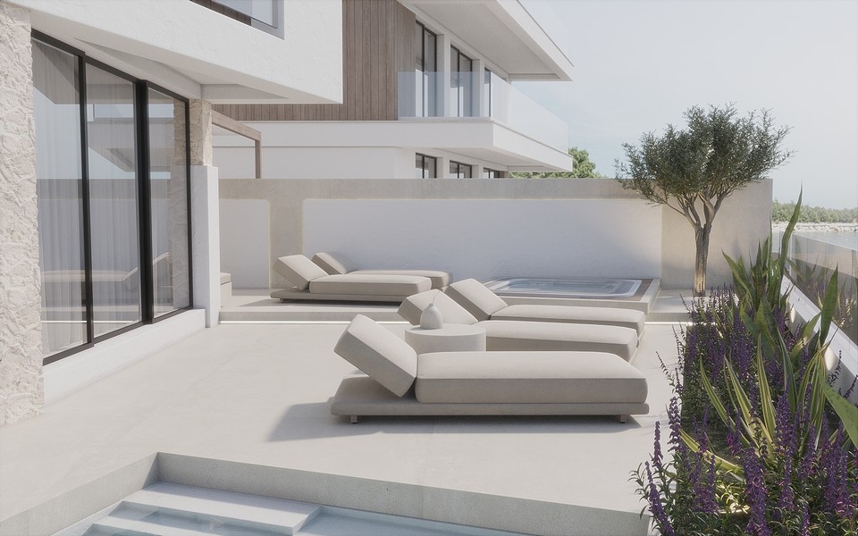 Die moderne Villa (vom Meer aus links gelegen) entsteht derzeit auf einem rund 324 m² großen Grundstück in direkter Meereslage. Die Wohnfläche von etwa 324 m² erstreckt sich über drei Ebenen und umfasst folgende Räumlichkeiten: