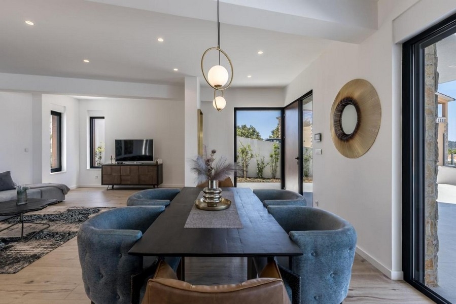 Der Außenbereich überzeugt mit Infinity-Swimmingpool, Sonnendeck, Grillplatz und drei Stellplätzen. Die Ausstattung der Villa ist hochwertig und modern.