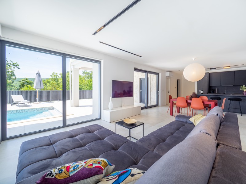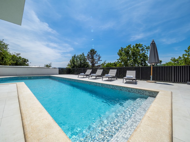 Zum Verkauf steht diese attraktive, im Jahr 2018 errichtete Villa mit Swimmingpool und Meerblick, eingebettet in eine ruhige und grüne Umgebung in der Region Vrbnik auf der Insel Krk (durch eine Brücke mit dem Festland verbunden).